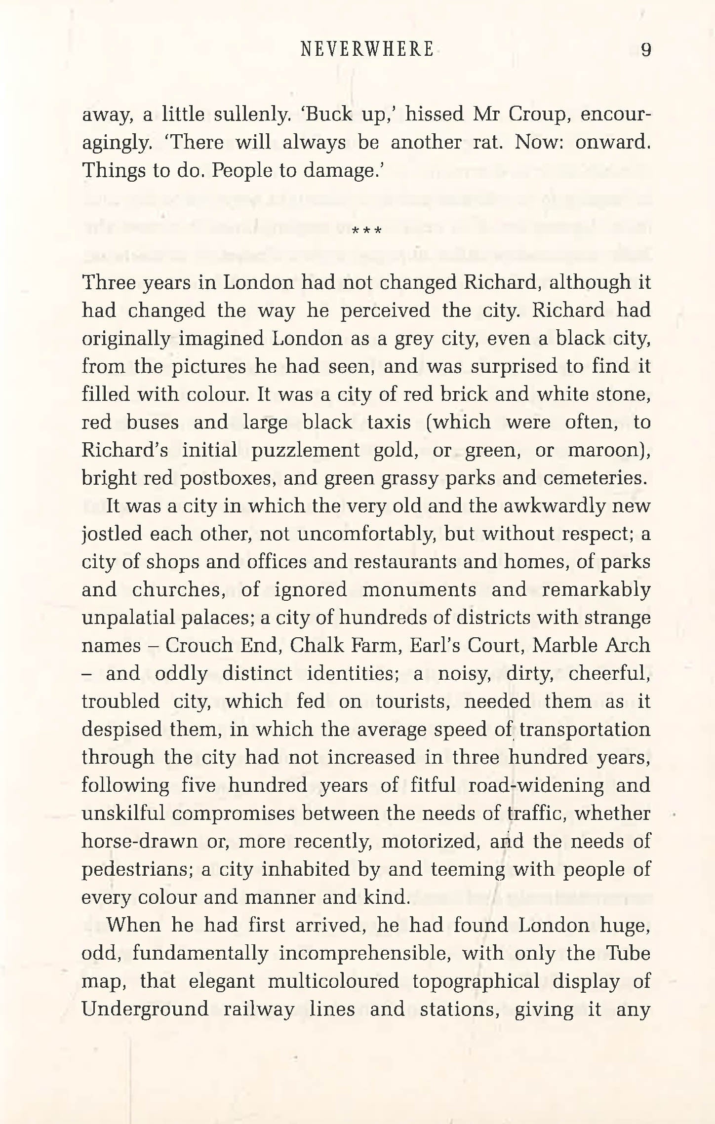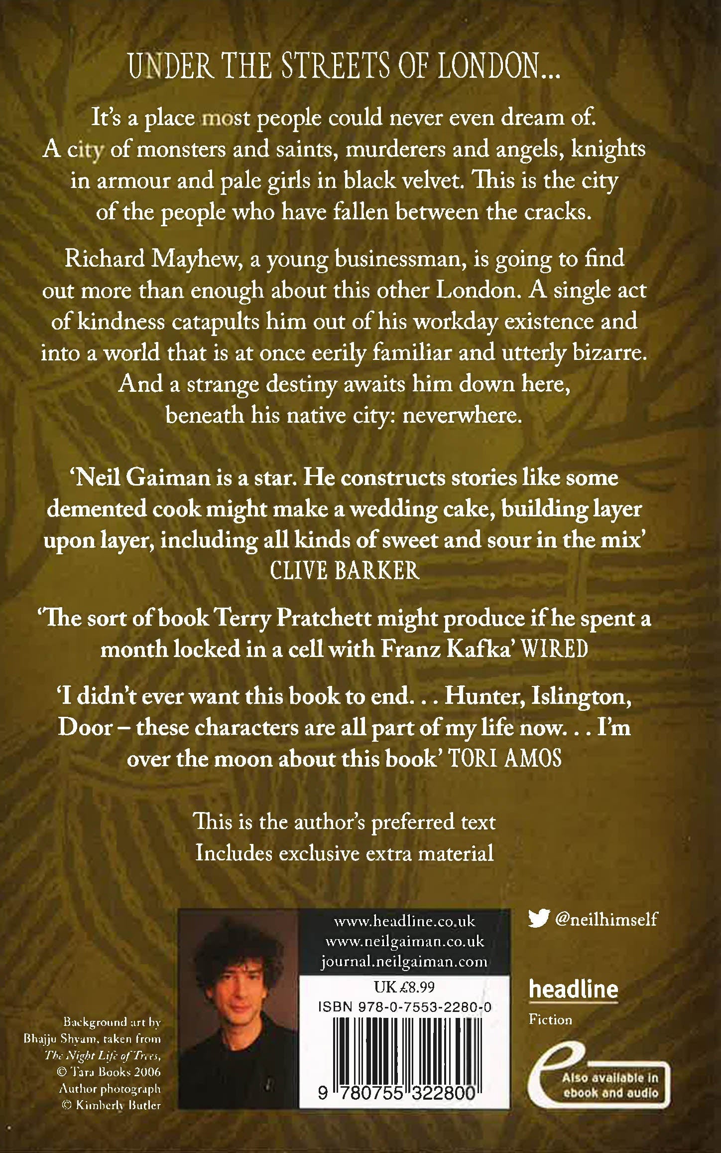 THE EXTRAORDINARY FIRST NOVEL BY THE MASTER OF STORYTELLING'Prose that dances and dazzles . . . Gaiman describes the indescribable' SUSANNA CLARKE'It's virtually impossible to read more than ten words by Neil Gaiman and not wish he would tell you the rest of the story' OBSERVER'Much too clever to be caught in the net of a single interpretation' PHILIP PULLMANACCLAIMED BBC RADIO 4 DRAMATISATION WITH ALL-STAR CAST INCLUDING JAMES MCAVOY, NATALIE DORMER, DAVID HAREWOOD, SOPHIE OKONEDO AND BENEDICT CUMBERBATCH---'I love doors. Anything that leads to possibilities' NEIL GAIMAN---Under the streets of London lies a world most people could never dream of.When Richard Mayhew stops to help a girl he finds bleeding in the street, his unremarkable life changes in an instant.This act of kindness leads him to a place filled with murderers and angels, pale girls in black velvet, a Beast in a labyrinth and an Earl who holds Court in a tube train. It is strangely familiar yet utterly bizarre.Here is London Below, the city of people who have fallen between the cracks. And for Richard Mayhew, it's just the beginning.NEIL GAIMAN. WITH STORIES COME POSSIBILITIES.---**Includes an introduction to the author's preferred text, How the Marquis Got His Coat Back short story, reading-group discussion questions, an 'Altogether Different Prologue' and an interview with Neil Gaiman**