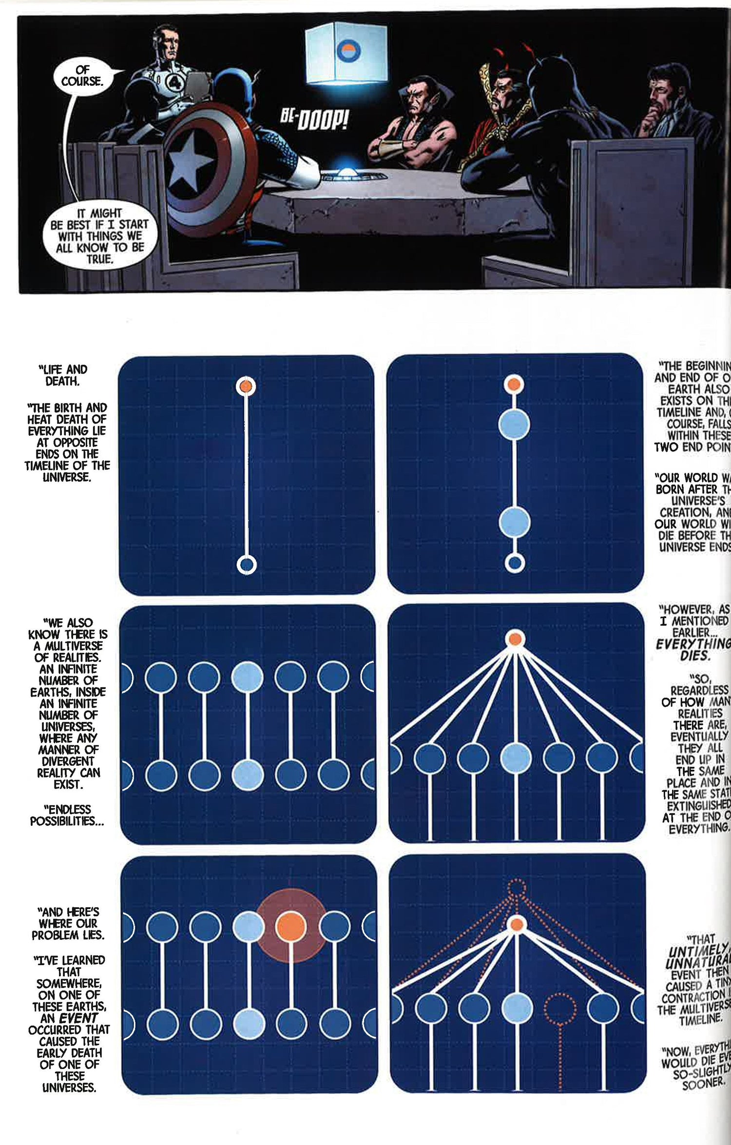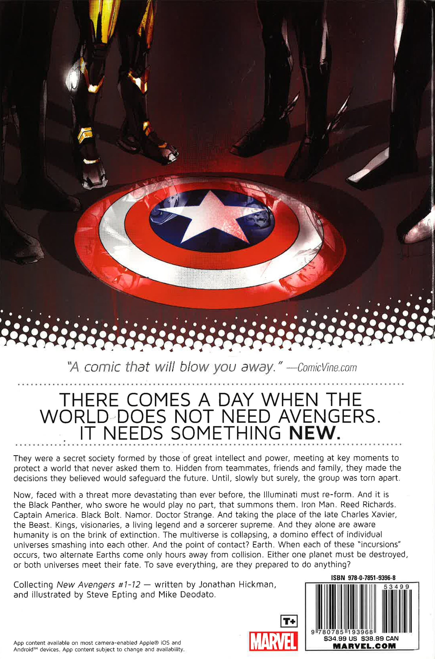 The Illuminati, Marvel's most powerful and secretive team, must reassemble to stand against interdimensional incursions! Parallel Earths are beginning to collide, destroying one or both worlds -and when Black Panther, Iron Man, Dr. Strange, Black Bolt, Mr. Fantastic, Sub-Mariner and Beast take on the task of preserving their planet, they soon realize that they must destroy countless others. And their grim task is complicated by old wounds, lies and secret agendas, as the cold war between Wakanda and Atlantis heats up into a full-scale conflict!