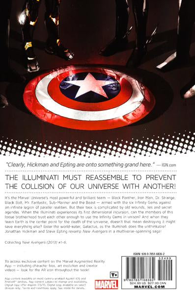 To prevent the collision of our universe with another, the Illuminati must reassemble...NOW! It's the most powerful and brilliant team in the Marvel Universe: the Black Panther, Iron Man, Doctor Strange, Black Bolt, Mister Fantastic, Namor the Sub-Mariner and the Beast against an infinite legion of parallel realities. Armed with the six Infinity Gems, the Illuminati gather to plan for the death of everything...but their task is complicated by old wounds, lies and secret agendas. But when the Illuminati experience their first dimensional incursion, can this loose brotherhood of end times trust each other enough to use the Infinity Gems in unison? And what new member will join the group? Jonathan Hickman and Steve Epting revamp the New Avengers in a multiverse-spanning saga!