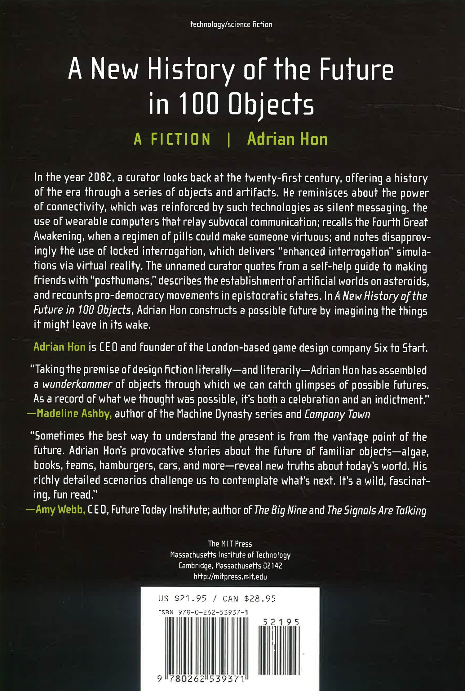 In the year 2082, a curator looks back at the twenty-first century, offering a history of the era through a series of objects and artifacts. He reminisces about the power of connectivity, which was reinforced by such technologies as silent messaging--wearable computers that relay subvocal communication; recalls the Fourth Great Awakening, when a regimen of pills could make someone virtuous; and notes disapprovingly the use of locked interrogation, which delivers "enhanced interrogation" simulations via virtual reality. The unnamed curator quotes from a self-help guide to making friends with "posthumans," describes the establishment of artificial worlds on asteroids, and recounts pro-democracy movements in epistocratic states. In A New History of the Future in 100 Objects, Adrian Hon constructs a possible future by imagining the things it might leave in its wake.