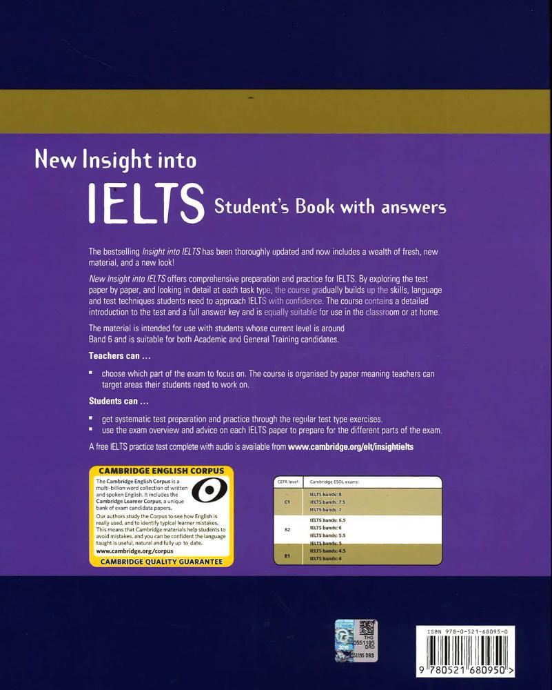 New Insight into IELTS offers comprehensive preparation and practice for IELTS.New Insight into IELTS offers comprehensive preparation and practice for IELTS. By exploring the test paper by paper, and looking in detail at each task type, the course gradually builds up the skills, language and test techniques students need to approach IELTS with confidence. The course contains a detailed introduction to the test and a full answer key and is equally suitable for use in the classroom or for self-study. The material is intended for use with students whose current level is around Band 6 and is suitable for both Academic and General Training candidates.