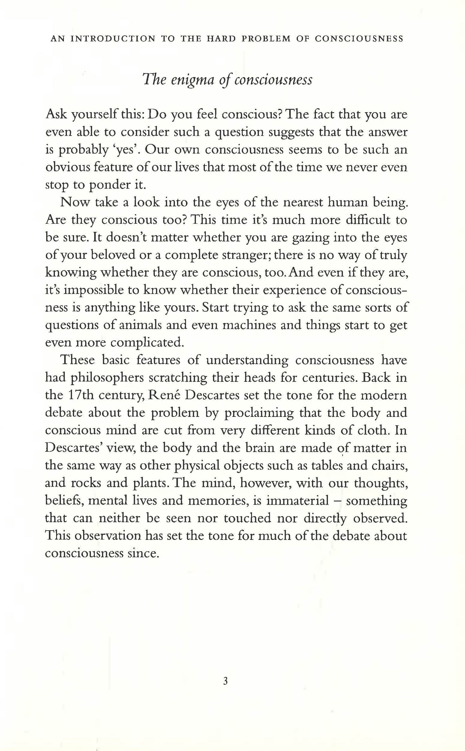 What is this strange mental world that seems so essential to being human? The conscious mind brings together sensations, perceptions, thoughts and memories to generate the seamless movie of a person's life. It makes us aware of the world around us and our own self. How all this emerges from a kilogram of brain cells is one of the greatest unanswered questions.