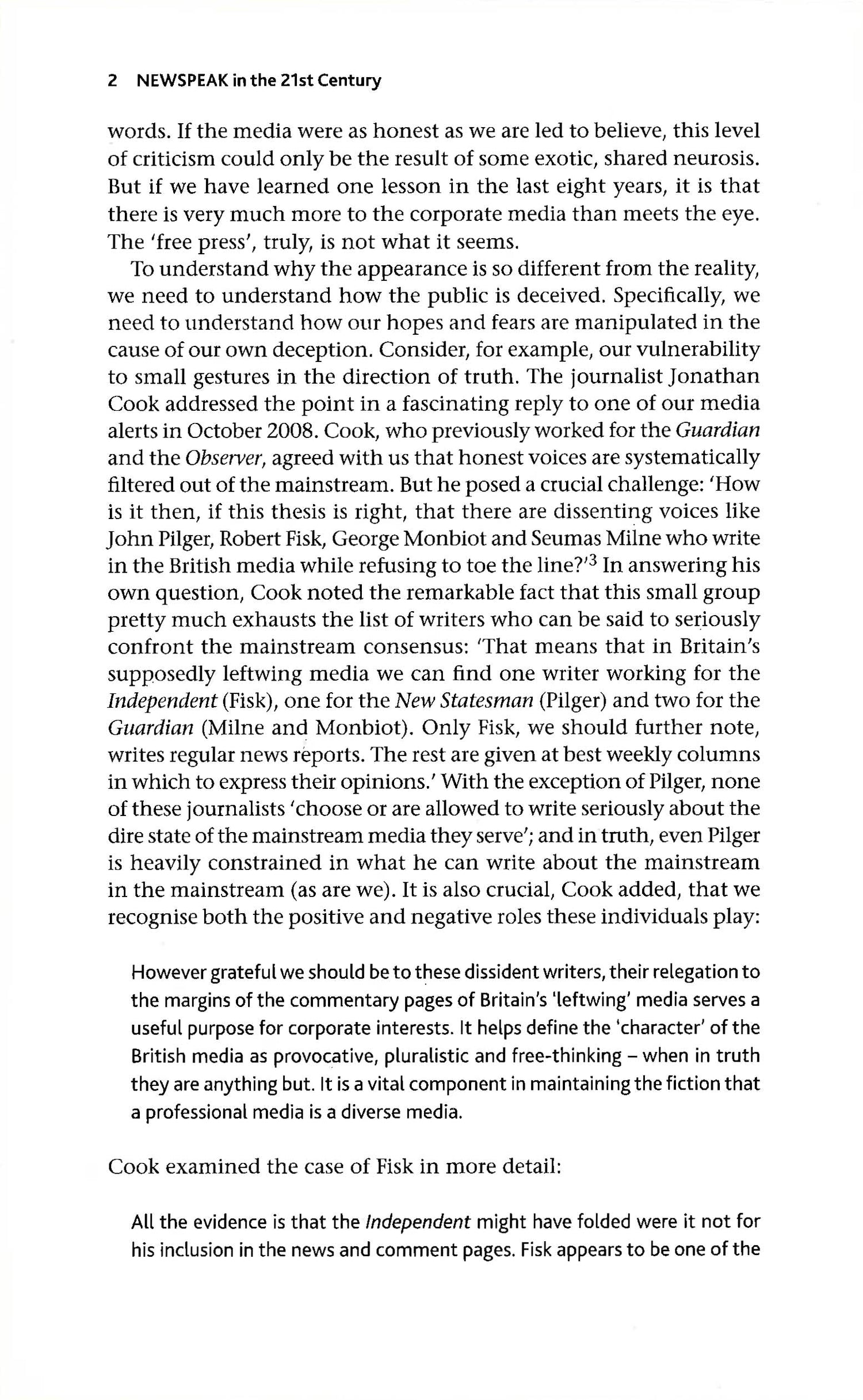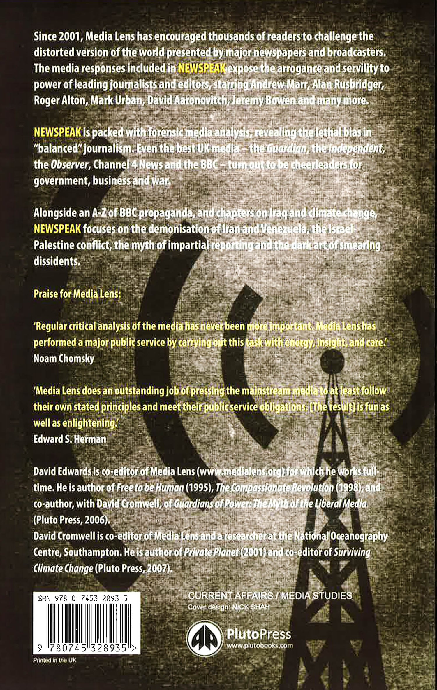 Media Lens' mission is to correct the distorted vision of the liberal media. A thorn in the side of the Guardian, Independent, Channel 4 and the BBC, among many others, it is constantly under counterfire by those it attacks. These responses are collected in Newspeak. They expose the arrogance and servility to power of our leading journalists and editors, starring Andrew Marr, Alan Rusbridger, Roger Alton, Jon Snow, Jeremy Bowen and even George Monbiot. Packed with forensic media analysis, revealing the lethal bias in 'balanced' reporting. Even the 'best' UK media turn out to be cheerleaders for government, business and war. Alongside an A-Z of BBC propaganda and chapters on Iraq and climate change, Newspeak focuses on the demonisation of Iran and Venezuela, the Israel-Palestine conflict, the myth of impartial reporting and the dark art of smearing dissidents.