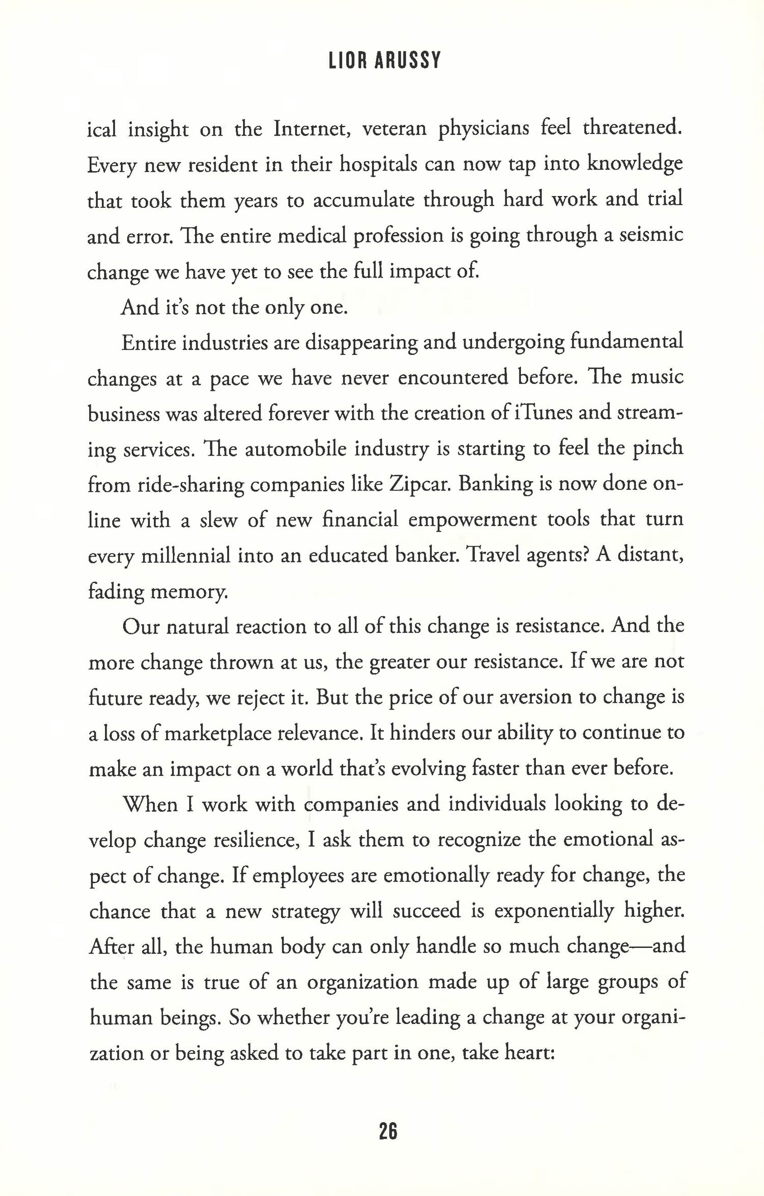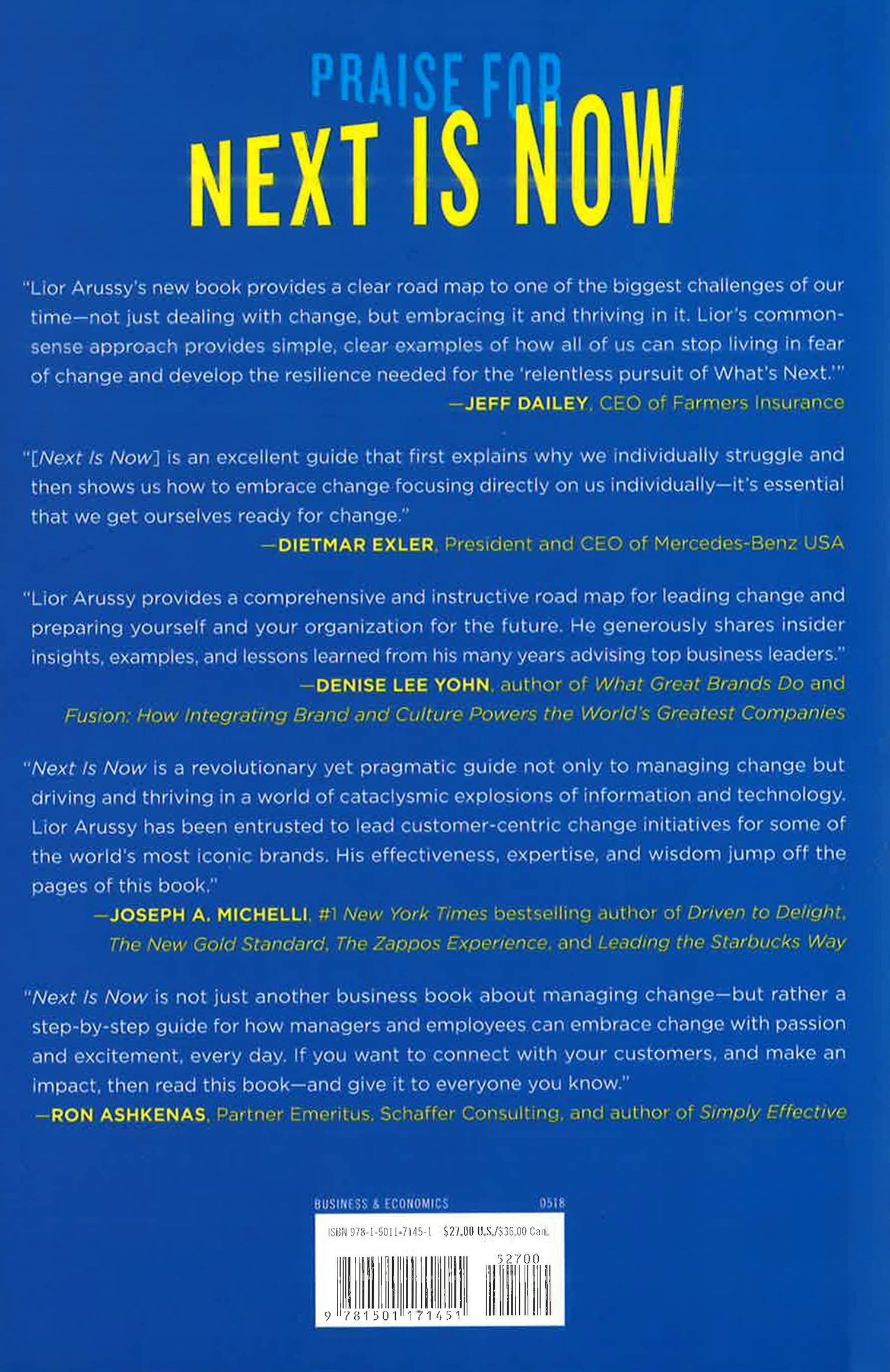 One of the world's leading authorities on customer-centric business transformation, Lior Arussy--founder and CEO of the global consulting firm Strativity Group--offers "a revolutionary, yet pragmatic guide to not only managing change, but driving and thriving in a world of cataclysmic explosions of information and technology" (Joseph Michelli, #1 New York Times bestselling author of Leading the Starbucks Way). The old business model of adapting to change for continued success is dead. Change is the new normal. There are no more periods of stability and predictability. There is only change. This continuous upheaval can undercut morale, decrease productivity and decimate profits, or it can be a game-changing opportunity. In Next Is Now, "Lior Arussy provides a comprehensive and instructive roadmap for leading change and preparing yourself and your organization for the future. He generously shares insider insights, examples, and lessons learned from his many years advising top business leaders." (Denise Lee Yohn, author of What Great Brands Do). He helps corporate leaders and their employees view change as an opportunity to become invested, drive that change, and achieve more success and job satisfaction than if change were simply implemented from the top down. Based on his experience working one-on-one with major corporate clients like Mercedes-Benz, Royal Caribbean Cruises, Thomson Reuters, HSBC and other Fortune 500 clients, Arussy shares his five-step Future Ready Impact program, guiding change-impacted employees and business owners from a victim mentality to one of participation and ownership. As Stephen Cannon, the former president and CEO of Mercedes-Benz USA, raves, "For anyone interested in building a thriving business, Lior Arussy's insights provide actionable steps to integrate into your plans for achieving success."