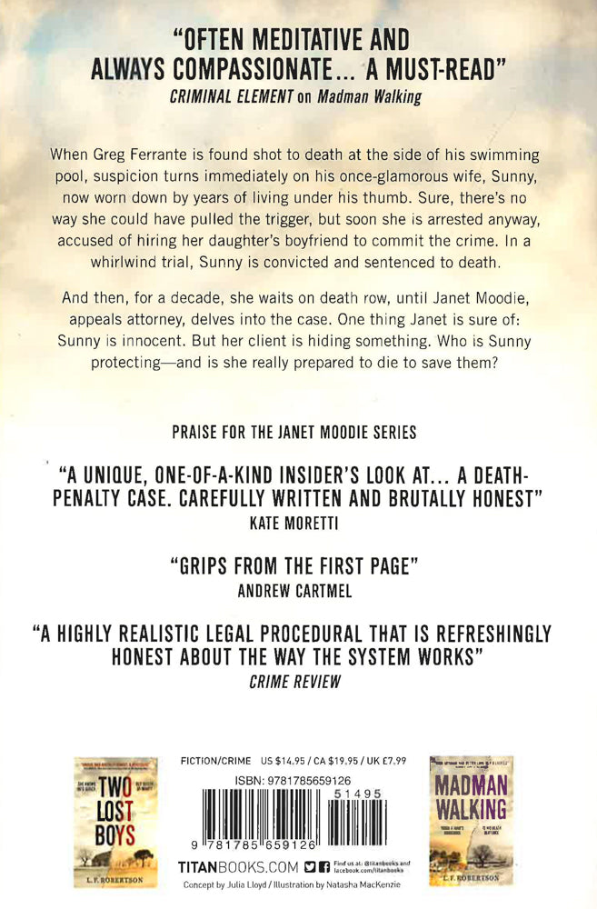 The third novel by L.F. Robertson, starring death row attorney Janet Moodie. J When Greg Ferrante is found shot to death at the side of his swimming pool, suspicion turns immediately on his once-glamorous wife, Sunny, now worn down by years of living under his thumb. Sure, there's no way she could have pulled the trigger, but soon she is arrested anyway, accused of hiring her daughter's boyfriend to commit the crime. In a whirlwind trial, Sunny is convicted and sentenced to death. And then, for a decade, she waits on death row, until Janet Moodie, appeals attorney, delves into the case. One thing Janet is sure of: Sunny is innocent. But her client is hiding something. Who is Sunny protecting-and is she really prepared to die to save them?