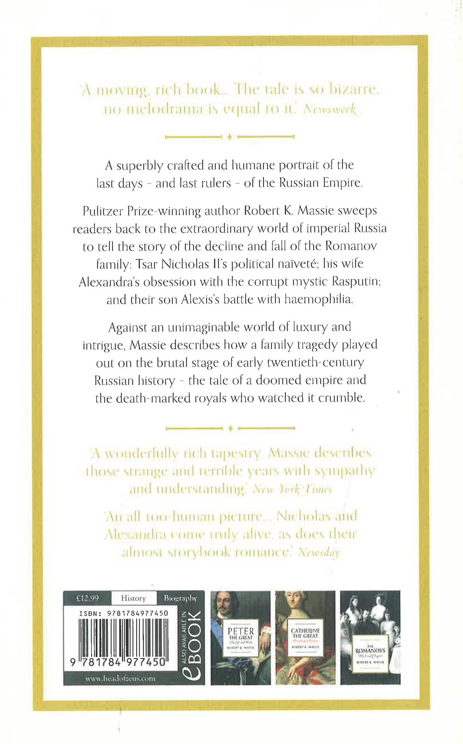 A superbly crafted and humane portrait of the last days - and last rulers - of the Russian Empire. Complementing his Pulitzer prize-winning Peter the Great, in this commanding book Robert K. Massie sweeps readers back to the extraordinary world of imperial Russia to tell the story of the decline and fall of the ruling Romanov family: Tsar Nicholas II's political naivete; his wife Alexandra's obsession with the corrupt mystic Rasputin; and their son Alexis's battle with haemophilia. Against a lavish backdrop of luxury and intrigue, Massie unfolds a family tragedy played out on the brutal stage of early twentieth-century Russian history - the tale of a doomed empire and the death-marked royals who watched it crumble.