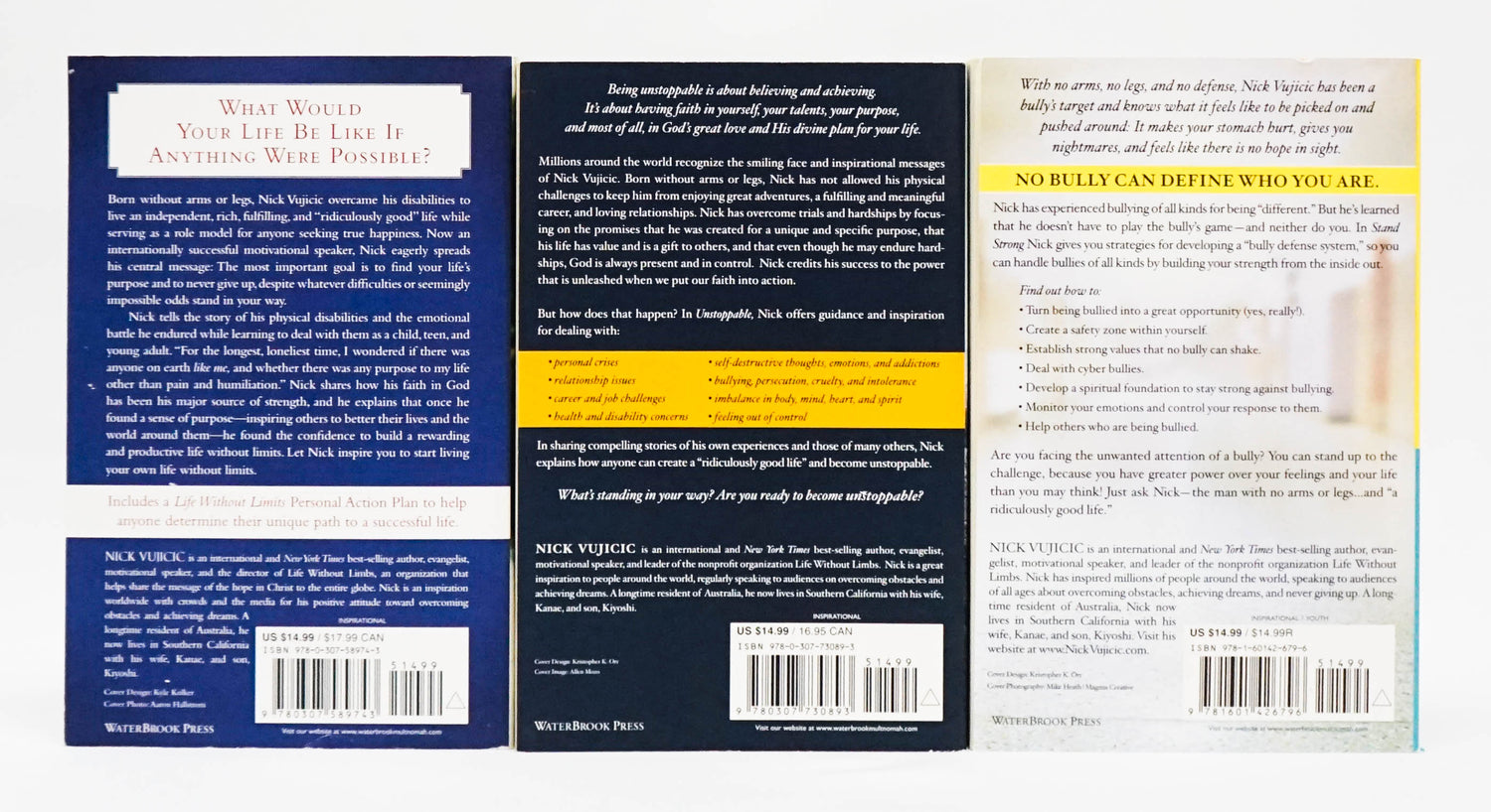 Being unstoppable is about believing and achieving. It's about having faith in yourself, your talents, your purpose, and most of all, in God's great love and His divine plan for your life. Millions around the world recognize the smiling face and inspirational messages of Nick Vujicic. Born without arms or legs, Nick has not allowed his physical challenges to keep him from enjoying great adventures, a fulfilling and meaningful career, and loving relationships. Nick has overcome trials and hardships by focusing on the promises that he was created for a unique and specific purpose, that his life has value and is a gift to others, and that even though he may endure hardships, God is always present and in control. Nick credits his success to the power that is unleashed when we put our faith into action.