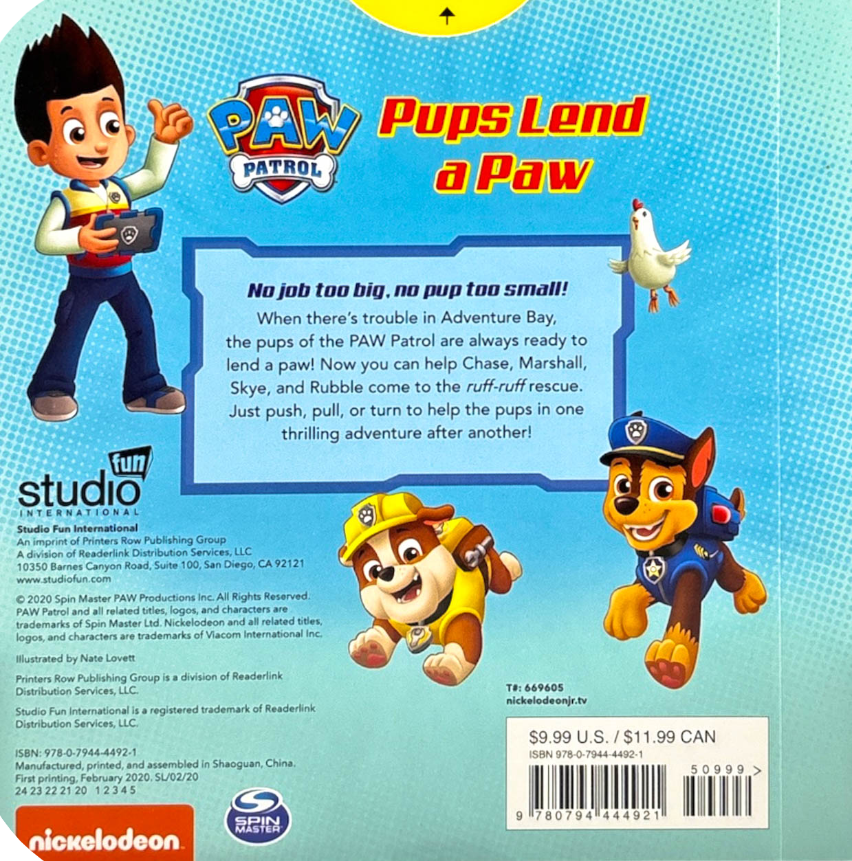 Get ready for a ruff-ruff rescue! Join Ryder and the pups from the PAW Patrol—Chase, Marshall, Skye, and Rubble—on their heroic adventures! Featuring pull-tabs and sliders, this sturdy board book will keep children entertained for hours. Based on the hit series, Nickelodeon PAW Patrol: Pups Lend a Paw puts the action in kids’ hands. The engaging and interactive sliders on each page brings the daring story to life while kids perfect their fine motor skills.