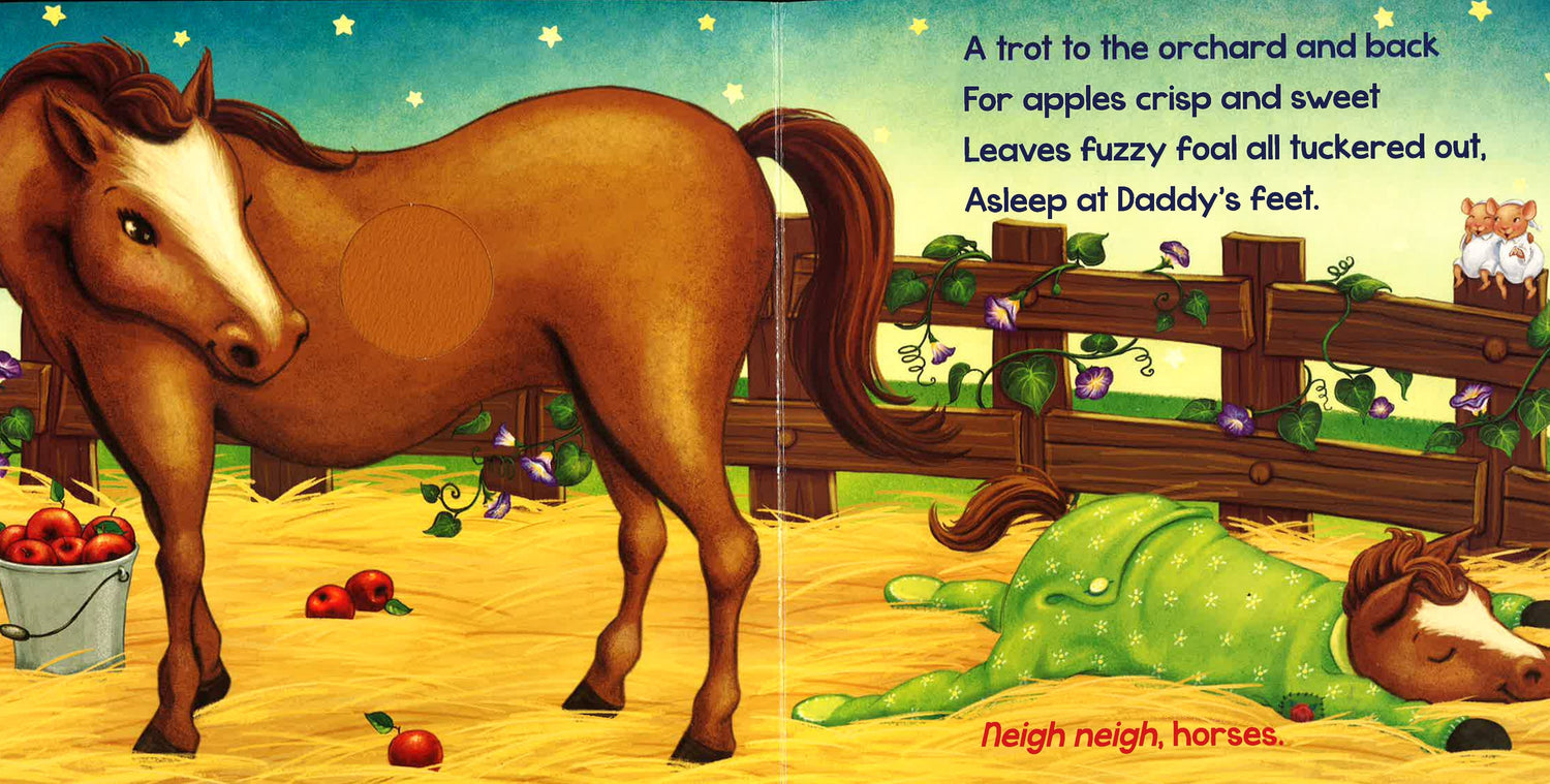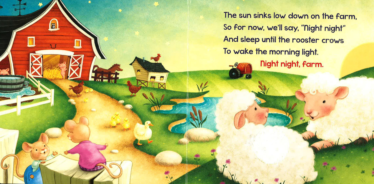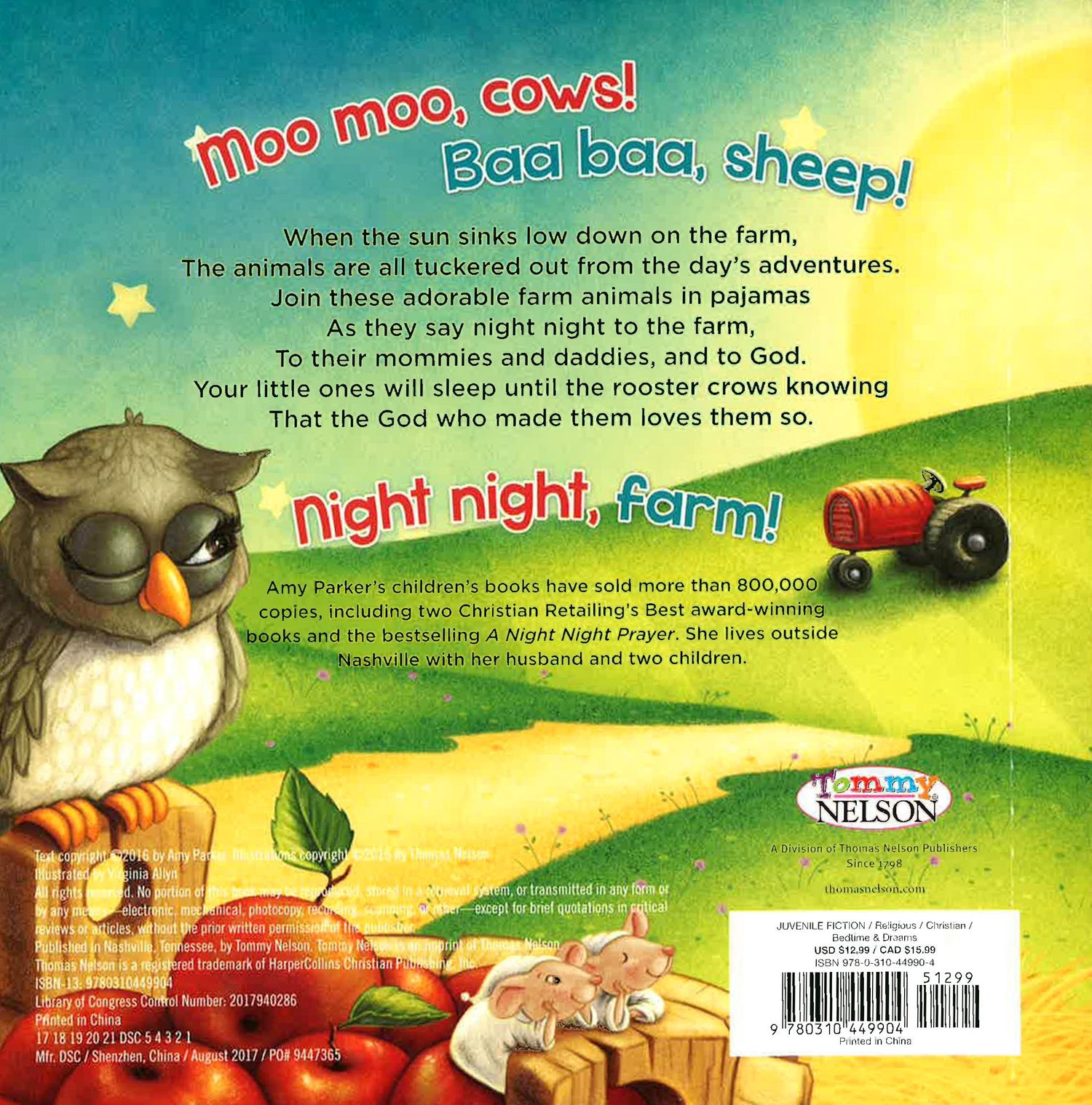 When the sun sinks low down on the farm, the animals are all tuckered out from the day's adventures. Join these adorable farm animals in pajamas as they say night night to the farm, to their mommies and daddies, and to God. Your little ones will sleep until the rooster crows knowing that the God who made them loves them so.