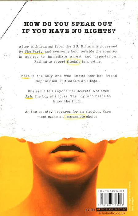 How do you speak out if you have no rights? In the near future, a right-wing party rules England, and the government deports anyone not "British Born". 'Illegal' teenager Zara witnesses a crime, but she must stay in hiding to protect her own future. When romance blossoms with the victim's brother, she inadvertently puts him in danger too. "A furious dystopian shoulder-shake ... Mathias's YA debut is a hundred-decibel alarm call" - The Guardian "A thrilling story with terrifying real-world resonance" - Irish Times How do you speak out if you have no rights? After withdrawing from the EU, Britain is governed by a far-right nationalist party. Its flagship policy is the British Born edict, which allows only those born in Britain to live here. Everyone else is an "illegal", subject to immediate arrest and deportation. But an election is coming soon, and all the polls point to a big loss for the ruling party. 18-year-old Londoner Ash is wrestling with grief after the loss of his sister Sophie, who died in a tragic drug-related accident at a party. He meets Zara on a stalled tube train and immediately falls for her. But Zara has secrets: not only is she an "illegal", but she's the only person who knows the truth about Sophie's death. Associating with Zara could jeopardize Ash's future, and if Zara comes forward with what she knows about the night Sophie died, she'll have no future in Britain at all. The election could save them. Or will it only bring disaster?
