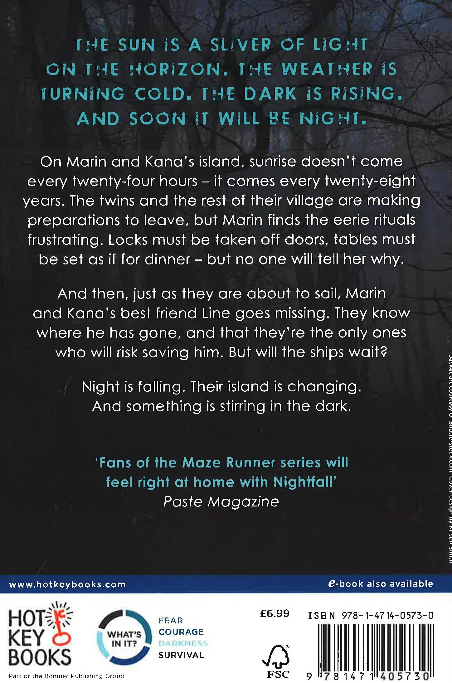 A story where edge-of-your-seat horror meets post-apocalyptic thriller, perfect for fans of Lois Lowry and The Mazerunner. On Marin's island, sunrise doesn't come every 24 hours - it comes every 28 years. Now the sun is just a sliver of light on the horizon. The weather is turning cold and the shadows are growing long. Because sunset triggers the tide to roll out hundreds of miles, the islanders are frantically preparing to sail south, where they will wait out the long night. Marin and her twin brother, Kana, help their anxious parents ready the house for departure. Locks must be taken off doors. Furniture must be arranged. Tables must be set. The rituals are puzzling - bizarre, even - but none of the adults in town will discuss why it has to be done this way. Just as the ships are about to sail, a teenage boy goes missing - the twins' friend Line. Marin and Kana are the only ones who know the truth about where Line's gone, and the only way to rescue him is by doing it themselves. But night is falling. Their island is changing. And it may already be too late.