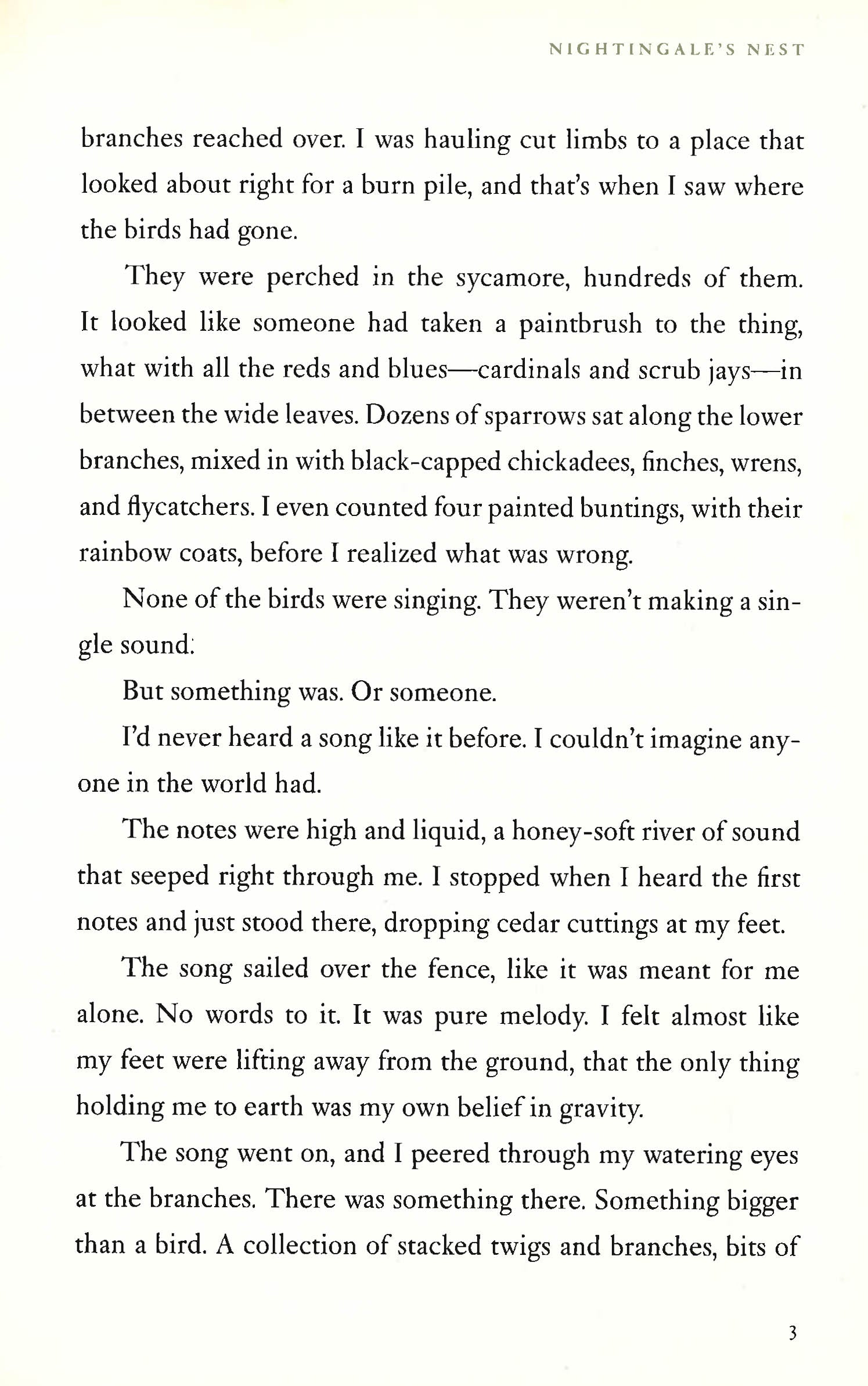 A powerful novel about friendship and family that calls to mind Bridge to Terabithia Twelve-year-old John Fischer Jr., or "Little John" as he's always been known, is spending his summer helping his father with his tree removal business, clearing brush for Mr. King, the wealthy owner of a chain of Texas dollar stores, when he hears a beautiful song that transfixes him. He follows the melody and finds, not a bird, but a young girl sitting in the branches of a tall sycamore tree. There's something magical about this girl, Gayle, especially her soaring singing voice, and Little John's friendship with Gayle quickly becomes the one bright spot in his life, for his home is dominated by sorrow over his sister's death and his parents' ever-tightening financial difficulties. But then Mr. King draws Little John into an impossible choice--forced to choose between his family's survival and a betrayal of Gayle that puts her future in jeopardy. Inspired by a Hans Christian Andersen story, Nightingale's Nest is an unforgettable novel about a boy with the weight of the world on his shoulders and a girl with the gift of healing in her voice.