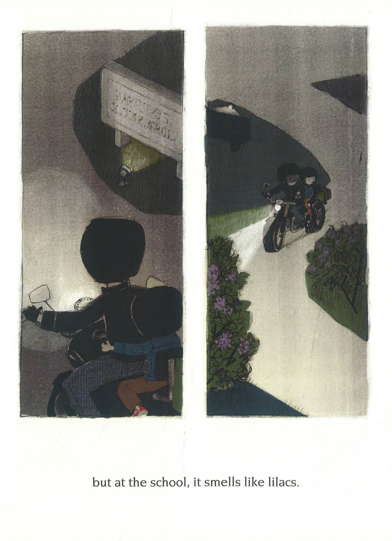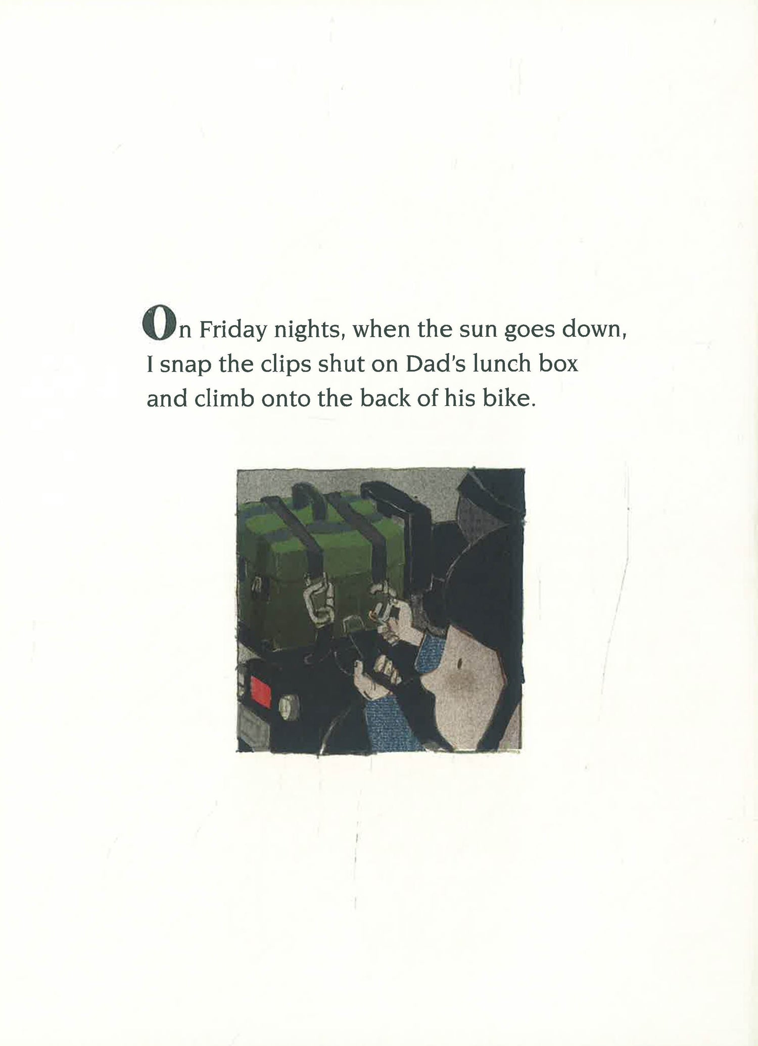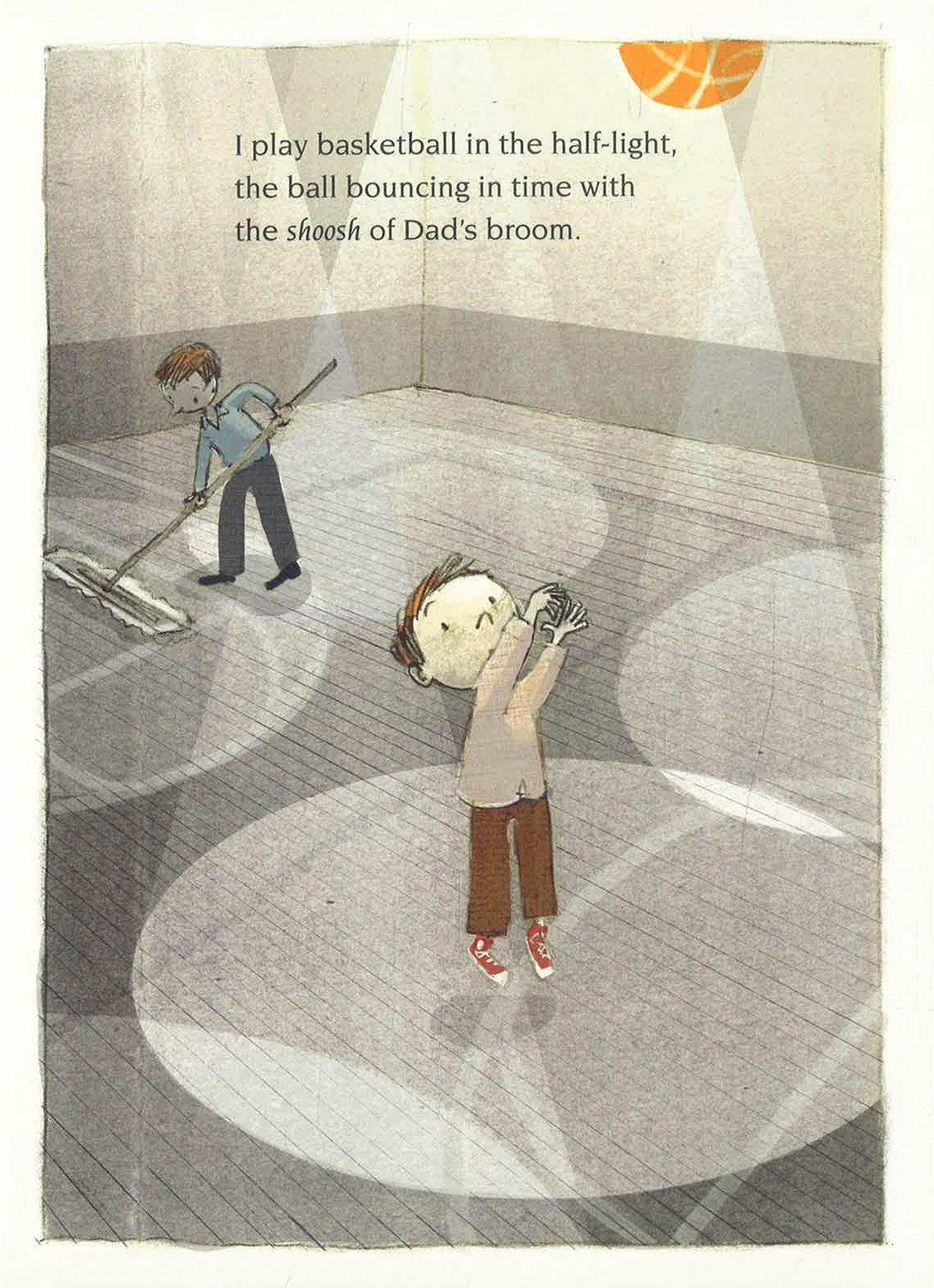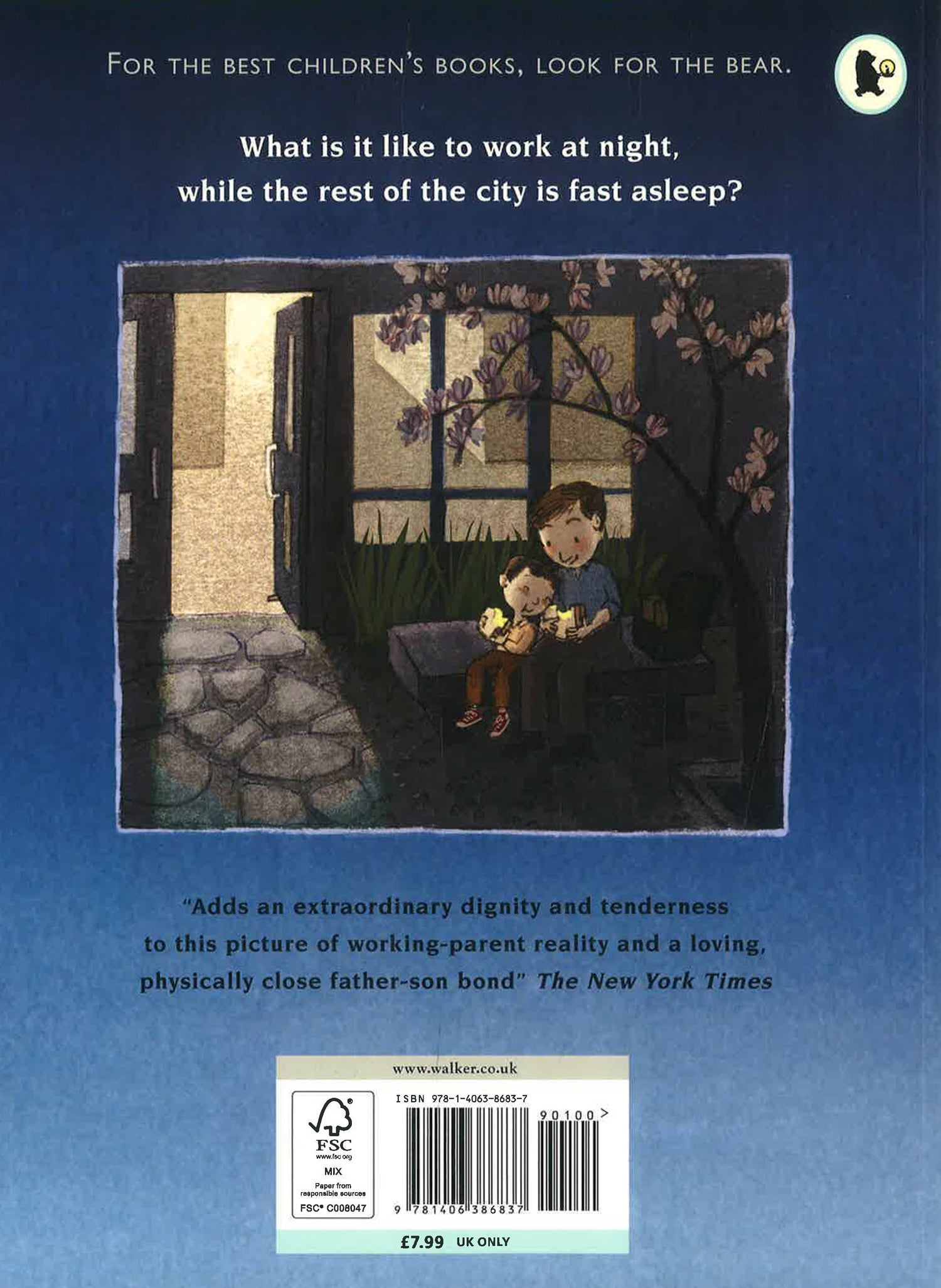When the sun sets, Dad's night shift as a school caretaker is just beginning. What is it like to work at night, while the rest of the city is asleep? There's the smell of lilacs in the night air, the dusky motorway in the moonlight and glimpses of shy night-time animals to make the dark magical. Playing basketball in the half-lit sport's hall, sweeping the stage with the match on the radio, and reading out loud to his father in the library all help the boy's time pass quickly. But what makes the night really special? Just being with Dad.