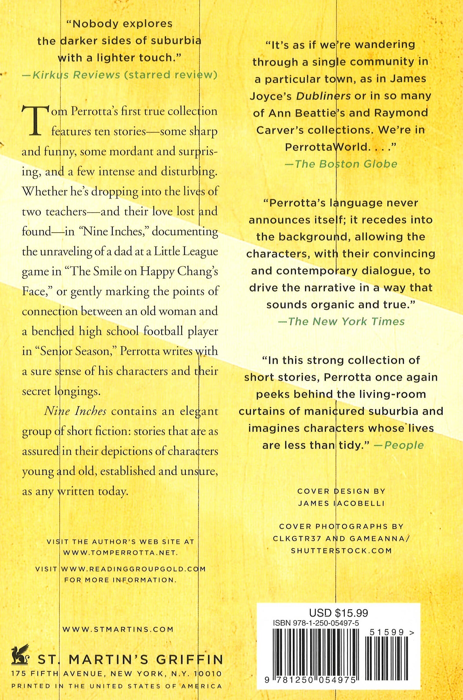 The new collection from the New York Times bestselling author of The Leftovers and Little Children, featuring stories focusing on Tom Perrotta's familiar suburban nuclear familiesNine Inches, Tom Perrotta's first true collection, features ten stories--some sharp and funny, some mordant and surprising, and a few intense and disturbing.Whether he's dropping into the lives of two teachers--and their love lost and found--in Nine Inches, documenting the unraveling of a dad at a Little League game in The Smile on Happy Chang's Face, or gently marking the points of connection between an old woman and a benched high school football player in Senior Season, Perrotta writes with a sure sense of his characters and their secret longings.Nine Inches contains an elegant collection of short fiction: stories that are as assured in their depictions of characters young and old, established and unsure, as any written today.