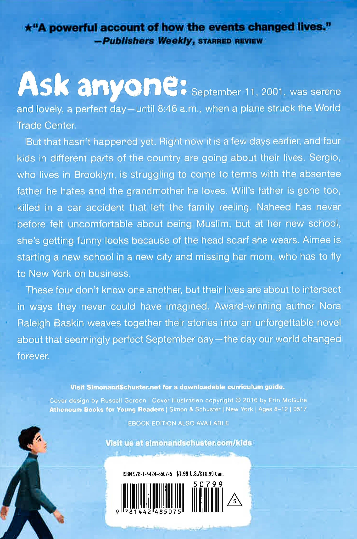 These four don’t know one another, but their lives are about to intersect in ways they never could have imagined. Award-winning author Nora Raleigh Baskin weaves together their stories into an unforgettable novel about that seemingly perfect September day—the day our world changed forever.