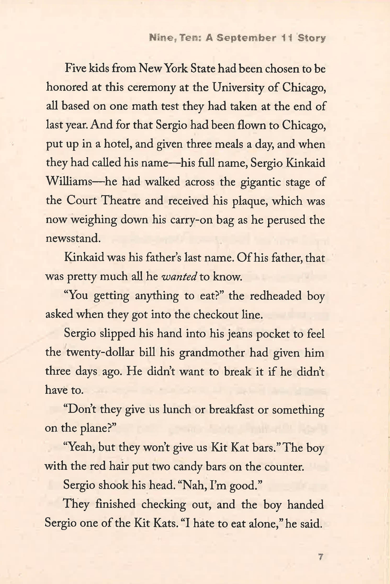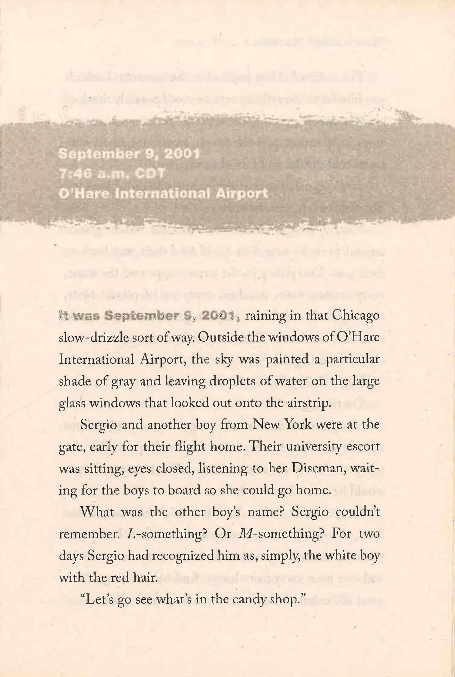 But right now it is a few days earlier, and four kids in different parts of the country are going about their lives. Sergio, who lives in Brooklyn, is struggling to come to terms with the absentee father he hates and the grandmother he loves. Will’s father is gone, too, killed in a car accident that has left the family reeling. Naheed has never before felt uncomfortable about being Muslim, but at her new school she’s getting funny looks because of the head scarf she wears. Aimee is starting a new school in a new city and missing her mom, who has to fly to New York on business.