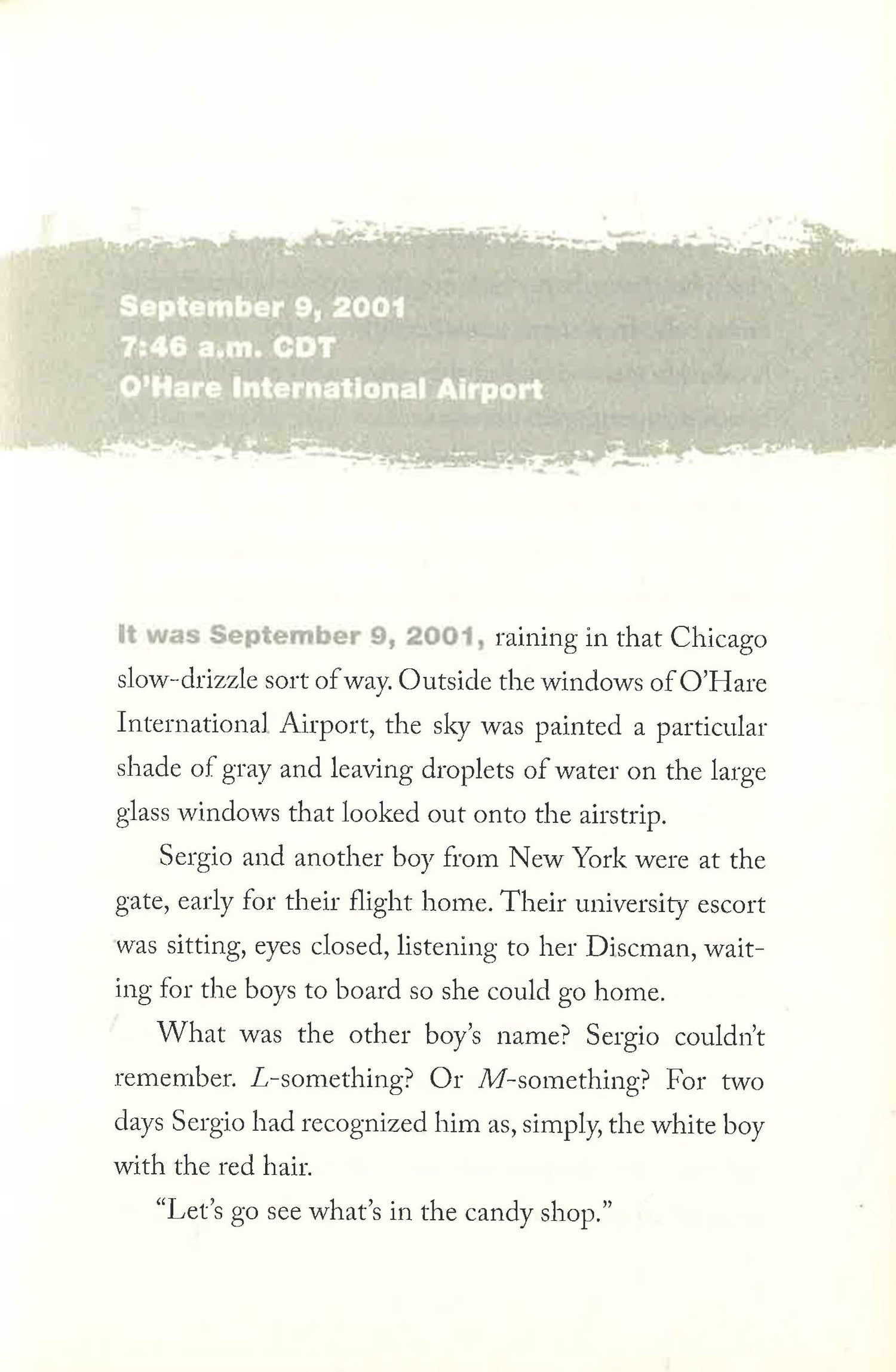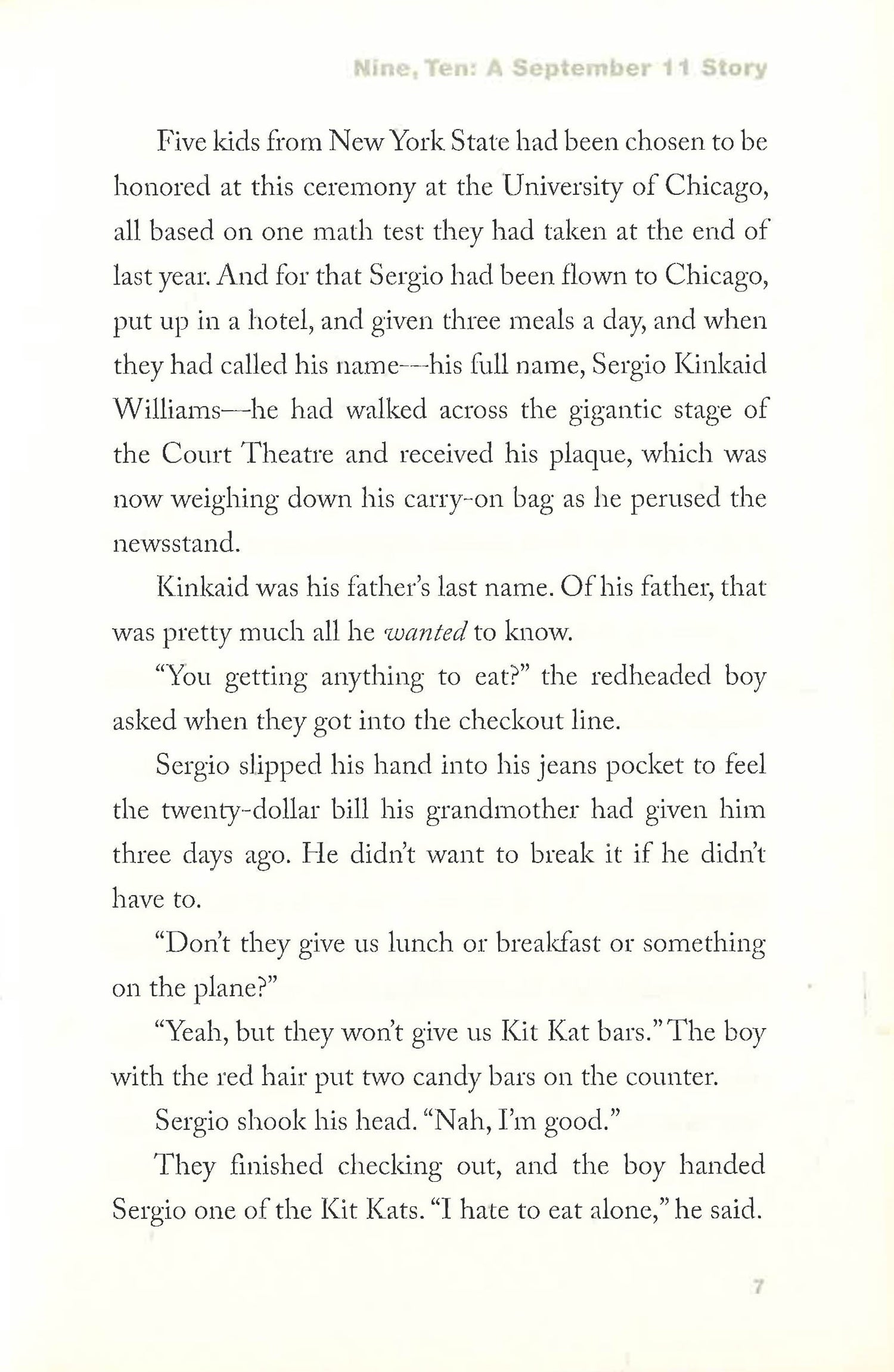 From the critically acclaimed author of Anything But Typical comes a touching look at the days leading up to the tragic events of September 11, 2001, and how that day impacted the lives of four middle schoolers. Ask anyone: September 11, 2001, was serene and lovely, a perfect day--until a plane struck the World Trade Center. But right now it is a few days earlier, and four kids in different parts of the country are going about their lives. Sergio, who lives in Brooklyn, is struggling to come to terms with the absentee father he hates and the grandmother he loves. Will's father is gone, too, killed in a car accident that has left the family reeling. Naheed has never before felt uncomfortable about being Muslim, but at her new school she's getting funny looks because of the head scarf she wears. Aimee is starting a new school in a new city and missing her mom, who has to fly to New York on business. These four don't know one another, but their lives are about to intersect in ways they never could have imagined. Award-winning author Nora Raleigh Baskin weaves together their stories into an unforgettable novel about that seemingly perfect September day--the day our world changed forever.