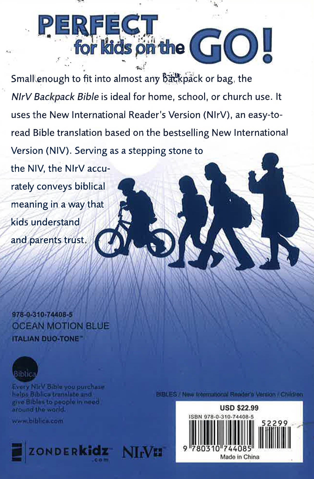 Small enough to fit into almost any backpack or bag, this backpack Bible is ideal for home, school, or church use. It uses the bestselling New International Reader's Version (NIrV), written at a third grade reading level and based on the original New International Version (NIV). Serving as a stepping stone to the NIV, the NIrV accurately conveys biblical meaning in a format kids understand and parents trust.