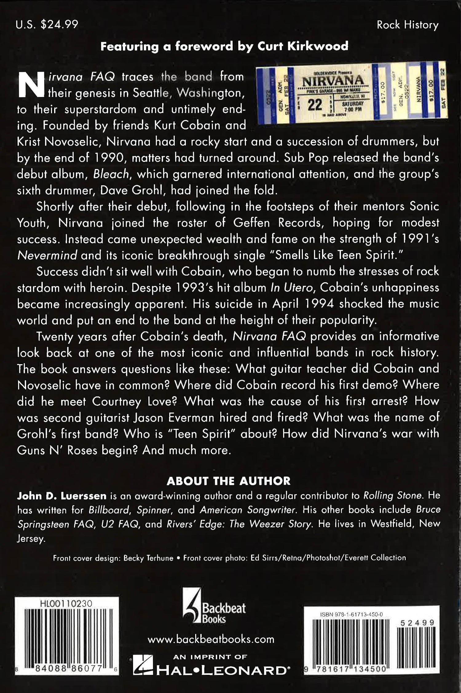 Nirvana FAQ traces the band from its genesis to its end. Founded by friends Kurt Cobain and Krist Novoselic Nirvana had a rocky start and a succession of drummers but by the end of 1990 its debut album EBleachE had garnered international attention and the group's sixth drummer Dave Grohl had joined the fold.THFollowing its mentors Sonic Youth to Geffen Records Nirvana had hoped for modest success. Instead came unexpected wealth and fame on the strength of 1991's ENevermindE and its iconic breakthrough single Smells Like Teen Spirit. THSuccess didn't sit well with Cobain who began to numb the stresses of rock stardom with heroin. Despite 1993's hit album EIn UteroE Cobain's unhappiness became increasingly apparent. His suicide in April 1994 shocked the music world and put an end to a band at the height of its popularity.THENirvana FAQE answers such questions as What guitar teacher did Cobain and Novoselic have in common? Where did Cobain record his first demo? What was the cause of his first arrest? How was second guitarist Jason Everman hired and fired? What was the name of Grohl's first band and where did he meet Cobain and Novoselic? Who is Teen Spirit about? How did Nirvana's war with Guns N' Roses begin? And more