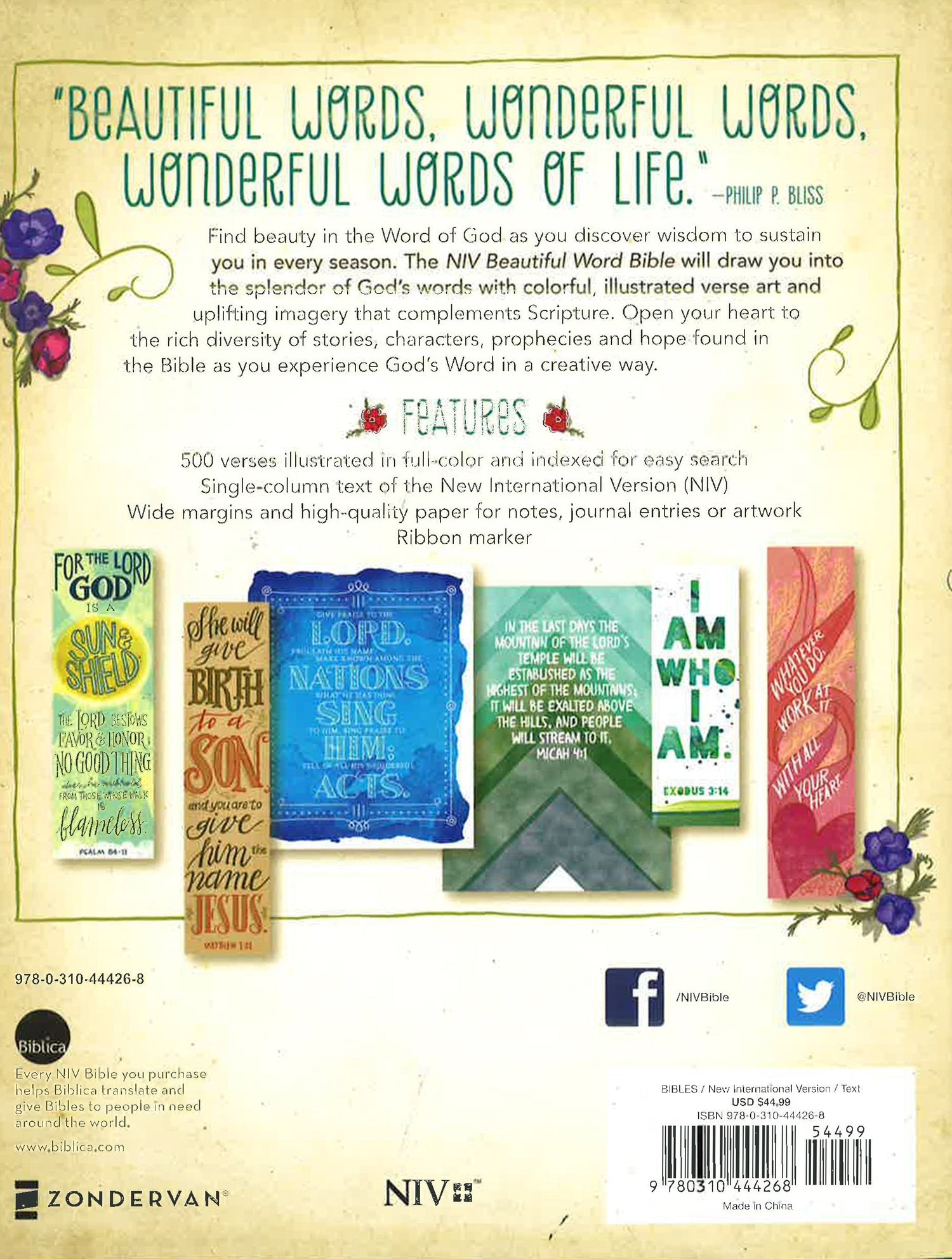 Be drawn into God’s Word through a fresh, creative expression of the beautiful words of God. Crafted on high-quality paper and balanced with inspiring full-color art and blank space, the NIV Beautiful Word Bible will encourage a deeper and more authentic quiet time. With 500 verses illustrated to help you see the rich diversity of stories, characters, prophecies, rewards, and hope contained within Scripture, you will discover wisdom to sustain you in every season, drawing you deeper into God’s life-changing and inspired Word.Features include:Single-column text of the New International Version (NIV)500 full-color illustrated versesWide margins and high-quality paper for notes, journal entries or artworkRibbon markerIndex of illustrated Scripture passages