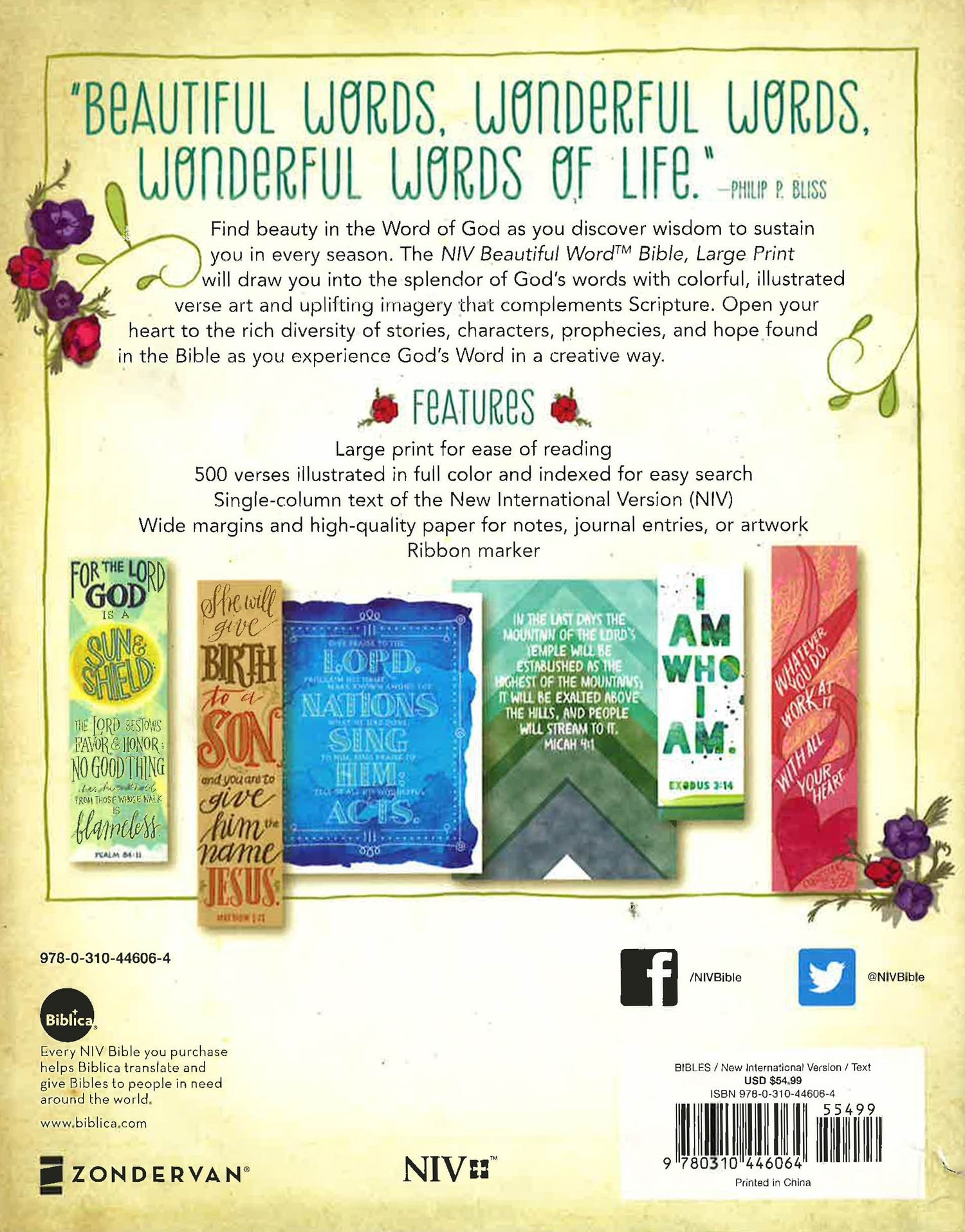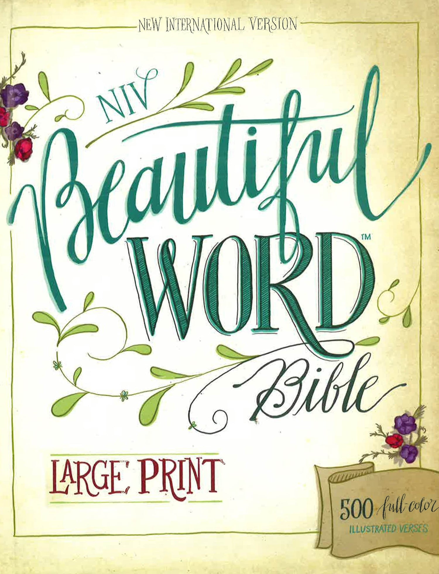 Be drawn into God's Word through a fresh, creative expression of the beautiful words of God. Crafted on high-quality paper and balanced with inspiring full-color art and blank space, the NIV Beautiful WordTM Bible, Large Print will encourage a deeper and more authentic quiet time. With 500 verses illustrated to help you see the rich diversity of stories, characters, prophecies, rewards, and hope contained within Scripture, you will discover wisdom to sustain you in every season, drawing you deeper into God's life-changing and inspired Word. Features include: Single-column, large-print text of the New International Version (NIV)500 full-color illustrated versesWide margins and high-quality paper for notes, journal entries or artworkRibbon markerIndex of illustrated Scripture passages10-point type size
