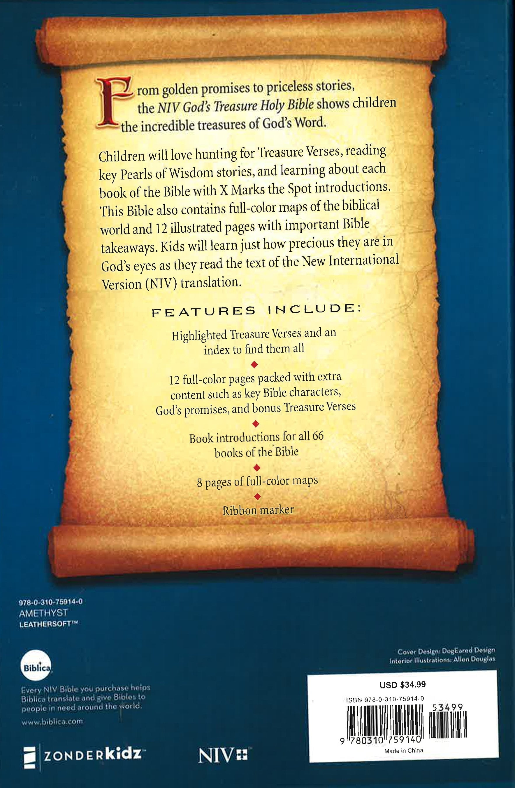 From golden promises to priceless stories, the NIV God's Treasure Holy Bible shows children the incredible treasures of God's Word. Children will love hunting for Treasure Verses, reading key Pearls of Wisdom stories, and learning about each book of the Bible with X Marks the Spot introductions. This Bible also contains full-color maps of the biblical world and 12 illustrated pages with important Bible takeaways. Kids will learn just how precious they are in God's eyes as they read the text of the New International Version (NIV) translation.