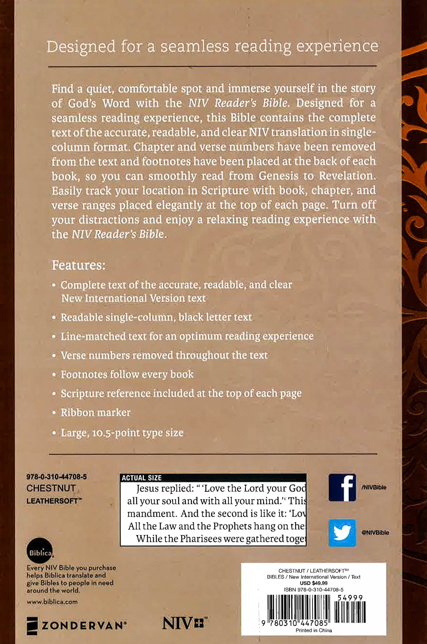 Find a quiet, comfortable spot and enter into the story of God's Word with the NIV Reader's Bible. This Bible contains the complete text of the accurate, readable, and clear NIV translation in single-column format without chapter and verse numbers in the text so you can immerse yourself in the story of Scripture. With footnotes at the back of each book, and scripture references elegantly noted at the top of each page, you can smoothly read from Genesis to Revelation while easily tracking your location in the Scripture. Turn off your distractions and and enjoy a relaxing reading experience with the NIV Reader's Bible.