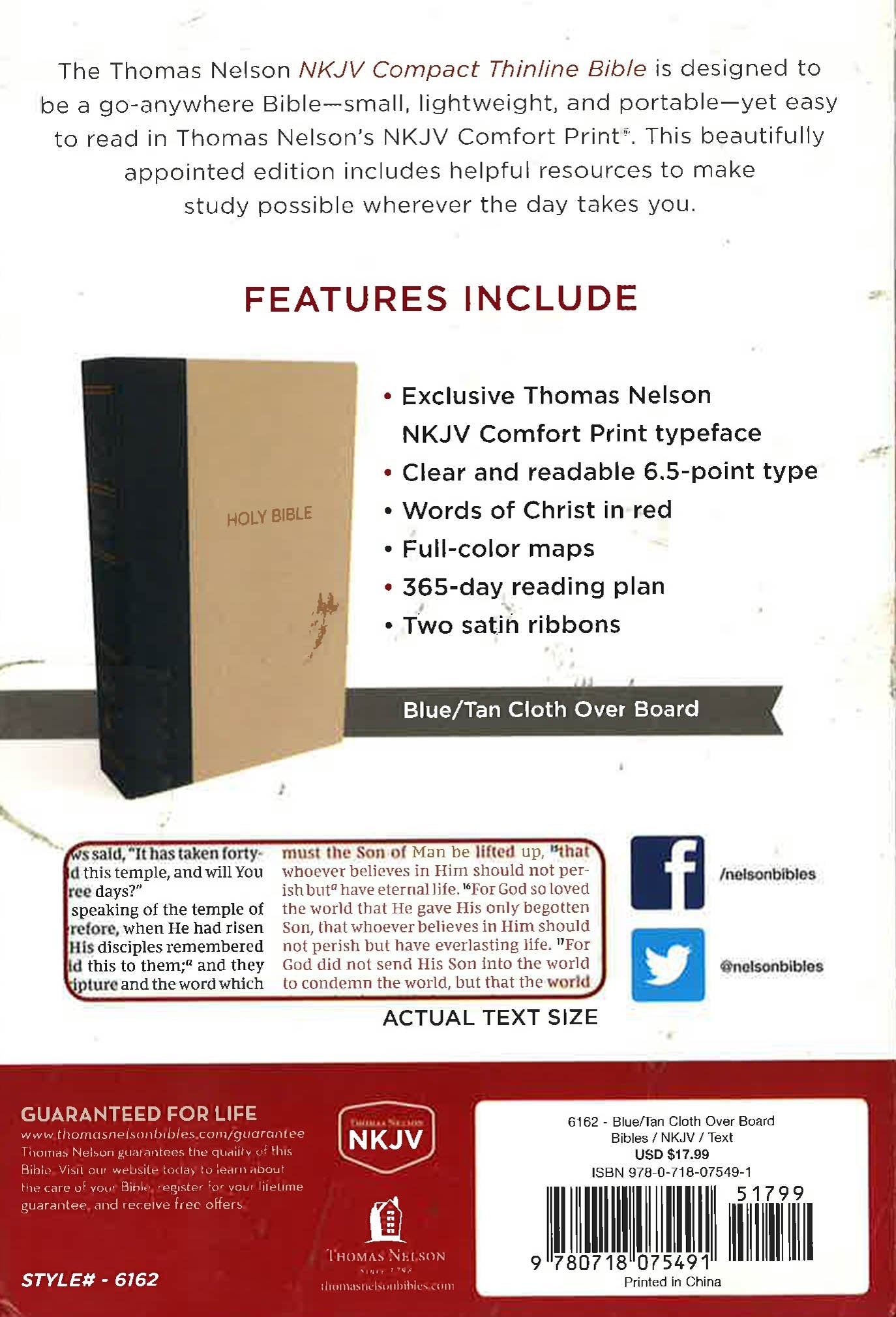 The Thomas Nelson NKJV Compact Thinline Bible is designed to be a go-anywhere Bible - small, lightweight, and portable - yet easy to read in Thomas Nelson's NKJV Comfort Print. This beautifully appointed edition includes helpful resources to make study possible wherever the day takes you. Features include: Clear and readable 6.5-point type, Words of Christ in red, Full-color maps, 365-day reading plan & Two satin ribbons.