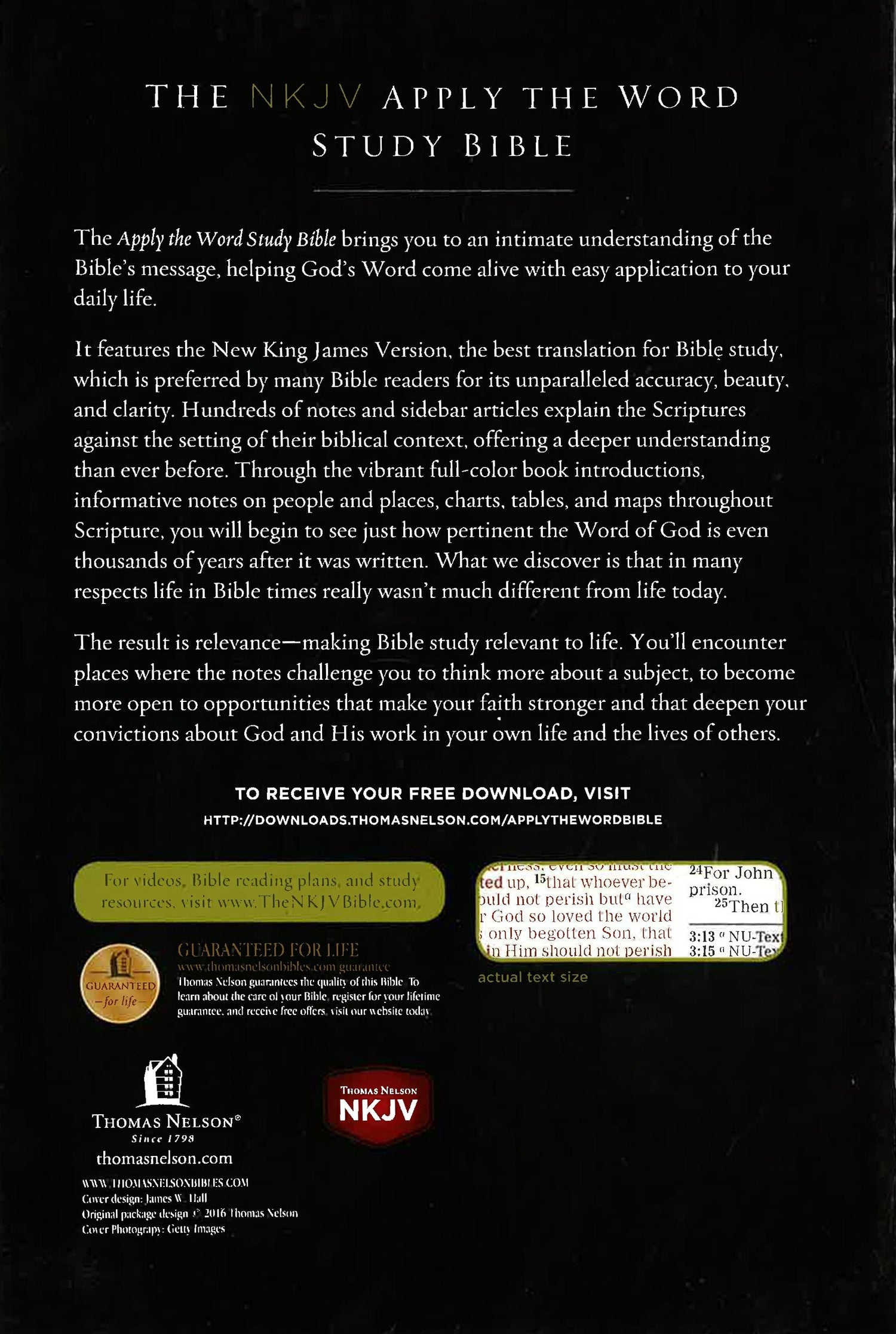 The Apply the Word Study Bible brings you to an intimate understanding of the Bible's message, helps you think about it and apply it to your lives. People of all ages and walks of life will enjoy the fresh style of the feature articles, which are directed at helping you approach life with the mind of Christ. You will discover that the Bible is a very practical book, just what is needed to guide you through every day. Featuring the New King James Version, the best translation for Bible study, abundant sidebar articles and vibrant full-color design, the Apply the Word Study Bible is the perfect companion for everyday living.Features include:* New King James Version, the best translation for study* Hundreds of sidebar articles for seeing the relevance of Scripture for everyday living* Insightful introductions to the books of the Bible* Informative notes about people and places of Bible times* Full-color page design provides a helpful and interesting visual encounter with Scripture* Charts, tables and maps provide abundant Bible information* Concordance for helpful reference* Full-color maps to illustrate the Bible lands