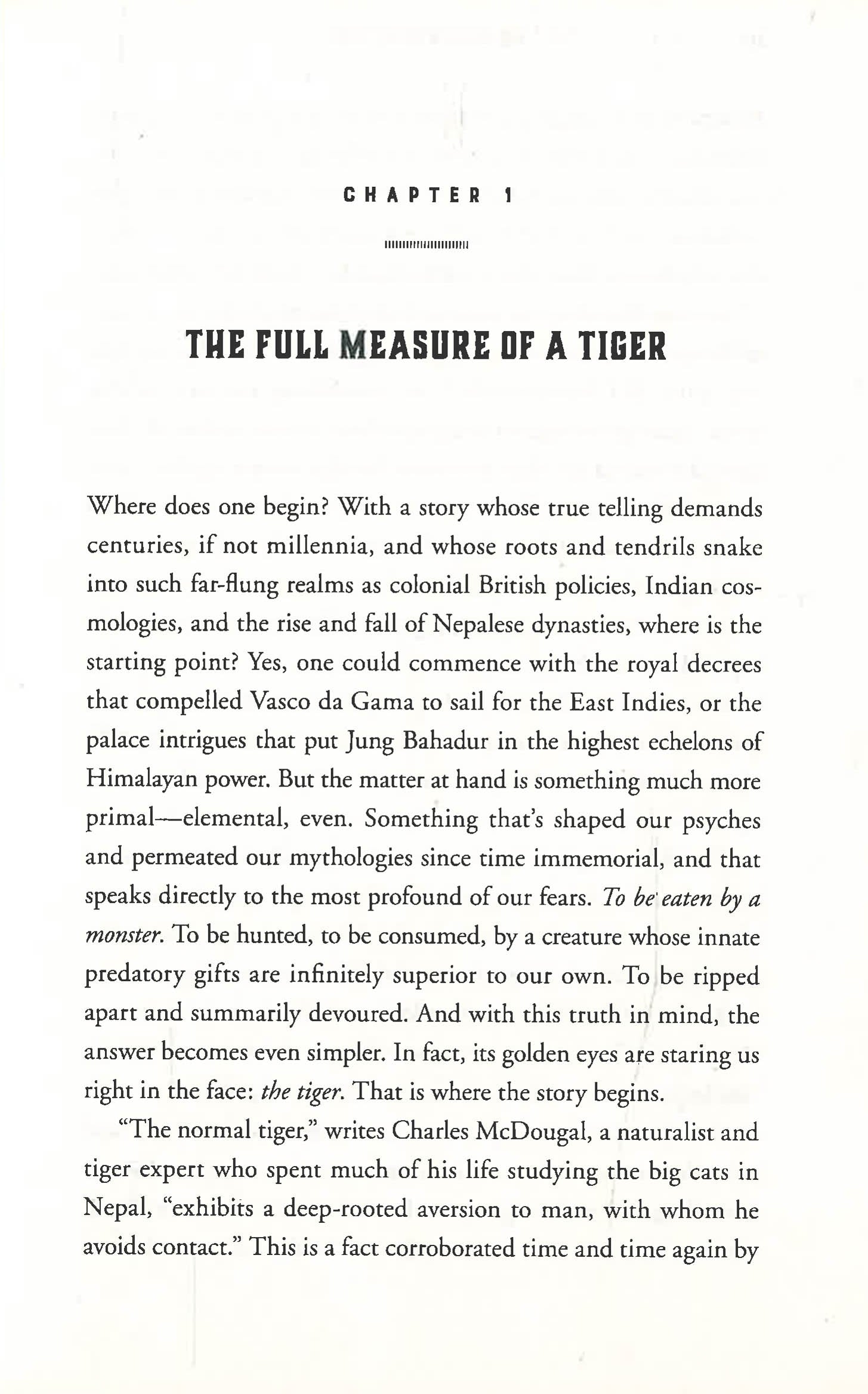 At the turn of the twentieth century as British rule of India tightened and bounties were placed on tiger's heads, a tigress was shot in the mouth by a poacher. Injured but alive, it turned from its usual hunting habits to easier prey--humans. For the next seven years, this man-made killer terrified locals, growing bolder with every kill. Colonial authorities, desperate for help, finally called upon Jim Corbett, a then-unknown railroad employee of humble origins who had grown up hunting game through the hills of Kumaon.