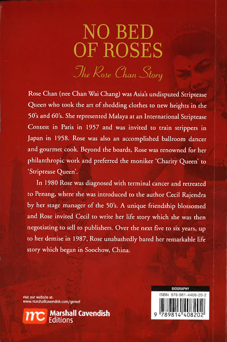 Rose Chan, "Queen of Striptease" at just 27 years old, enthralled men young and old in the heyday of cabaret in 1950s Malaya. Her accidental shot to fame, thanks to a wardrobe malfunction in which her bra snapped, catapulted her into the limelight. In No Bed of Roses, Cecil Rajendra pens an account of her life - her childhood in Soochow, China, and then in Kuala Lumpur and Singapore, her five marriages and personal struggles, how she circumvented the colonial decency laws that forbade nudity, and finally her fight with cancer that took her life in 1987 at the age of 62.