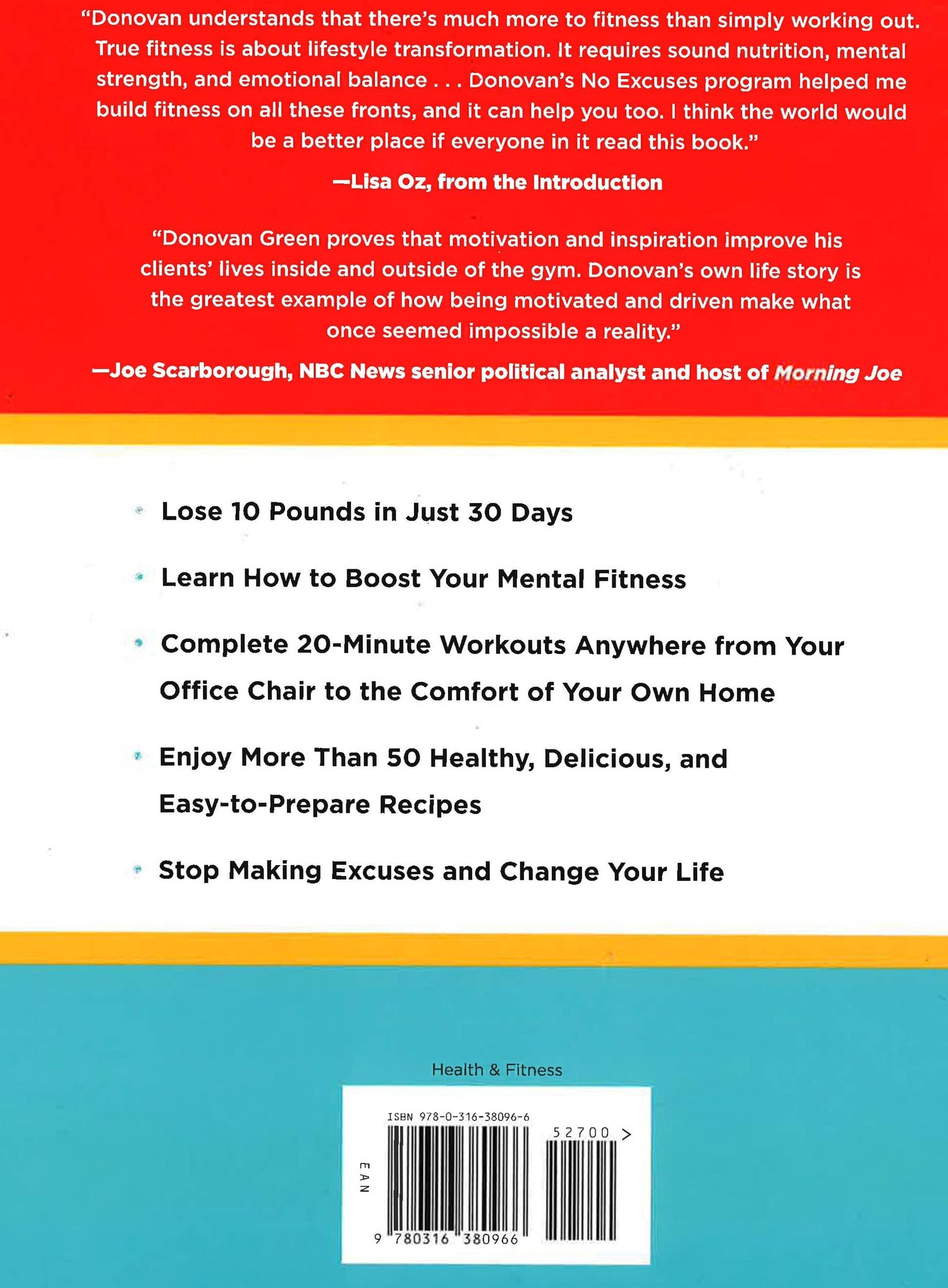 Between his positive, can-do spirit and practical, brass tacks strategies for getting in shape, it's no wonder that Donovan Green has reached 3.7 million daily viewers via his unique No Excuses platform on DrOz.com. With No Excuses Fitness, Green delivers a comprehensive month-long plan designed to help readers lose 10 pounds in 30 days. Filled with healthy recipes, workouts that can be done anywhere and with minimal equipment, and daily tips for staying focused (especially through plateaus), and featuring a foreword by Dr. Oz's wife Lisa, No Excuses Fitness will inspire and guide anyone interested in losing weight and gaining optimal health.