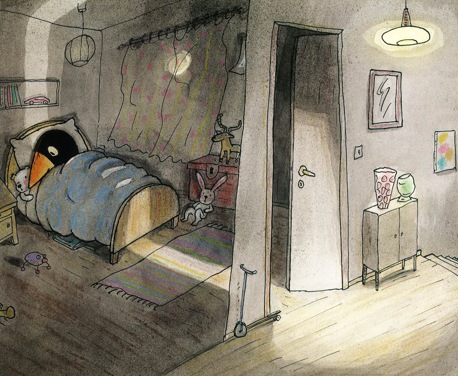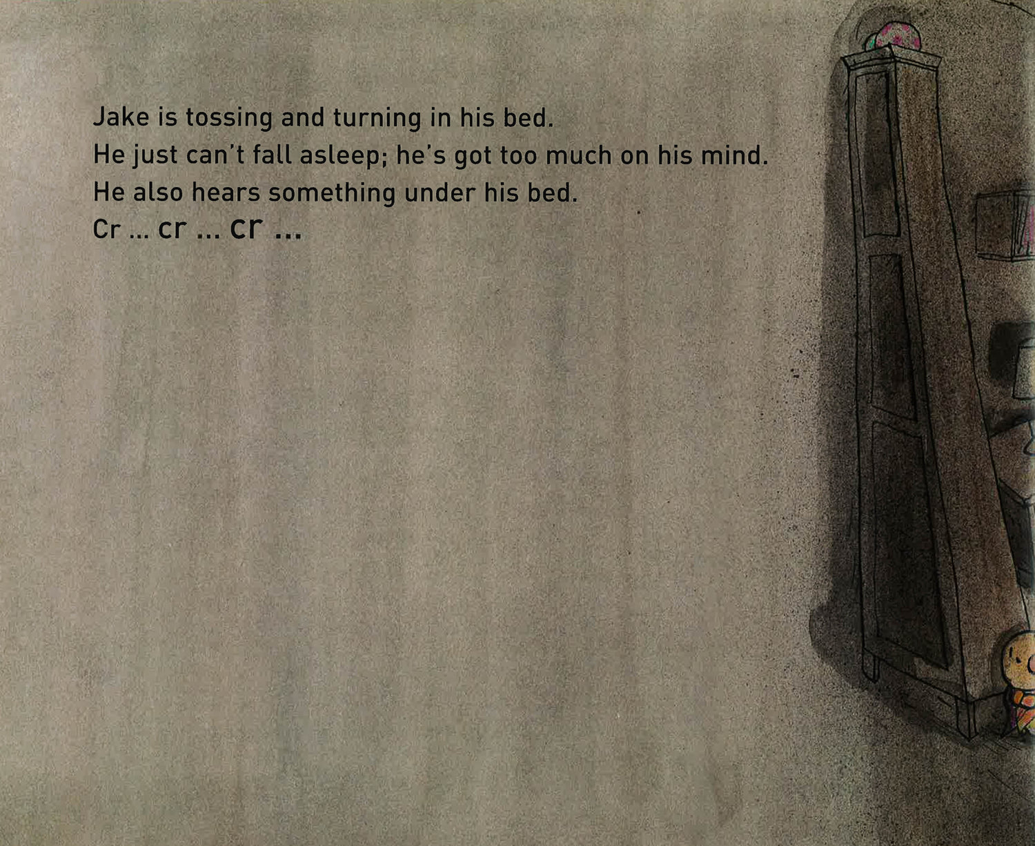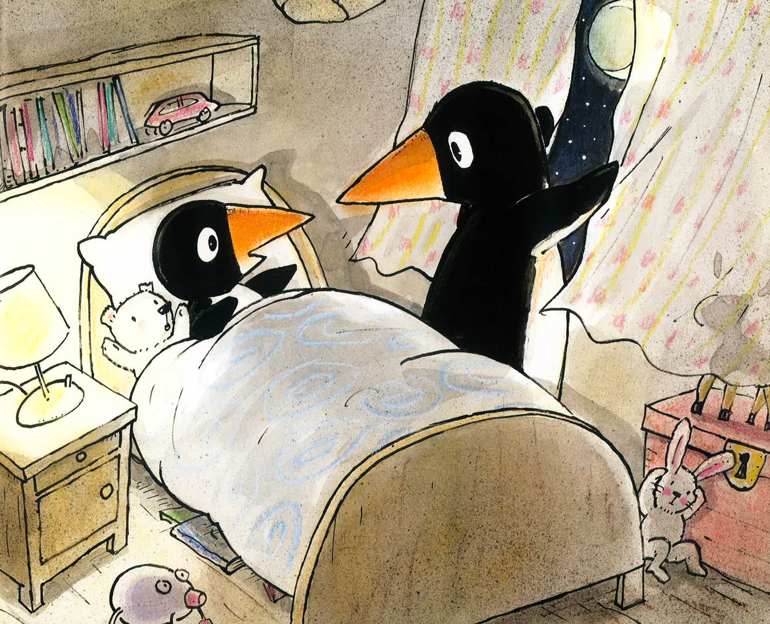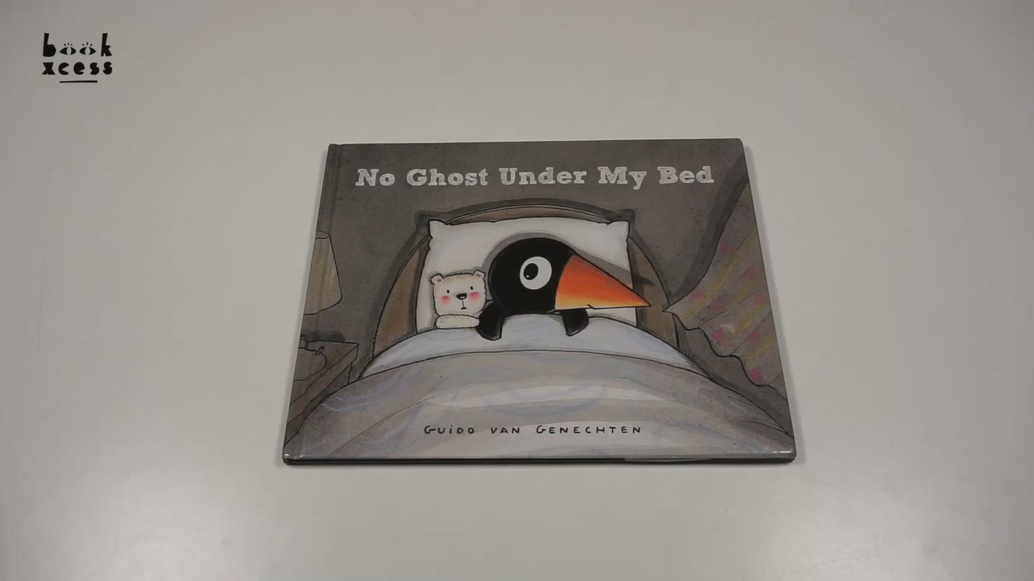 A father helps his child overcome a fear of ghosts in this humorous and lighthearted bedtime tale. The little penguin Jake hears all kinds of strange noises as he tries to fall asleep. Asking himself Could there be ghosts in the room? Jake quickly summons his Dad to check things out and make his room safe. Moving patiently from the bed to the curtain to the wardrobe and sticking his head under the carpet, Jake's dad explains that it's merely the bed creaking, the wind rustling the curtain, and there are only toys in the chest. Satisfied that his father has chased away all of the ghosts, Jake is finally ready for sleep.