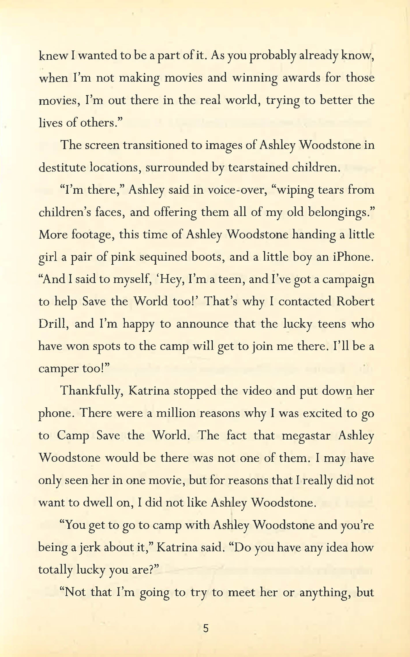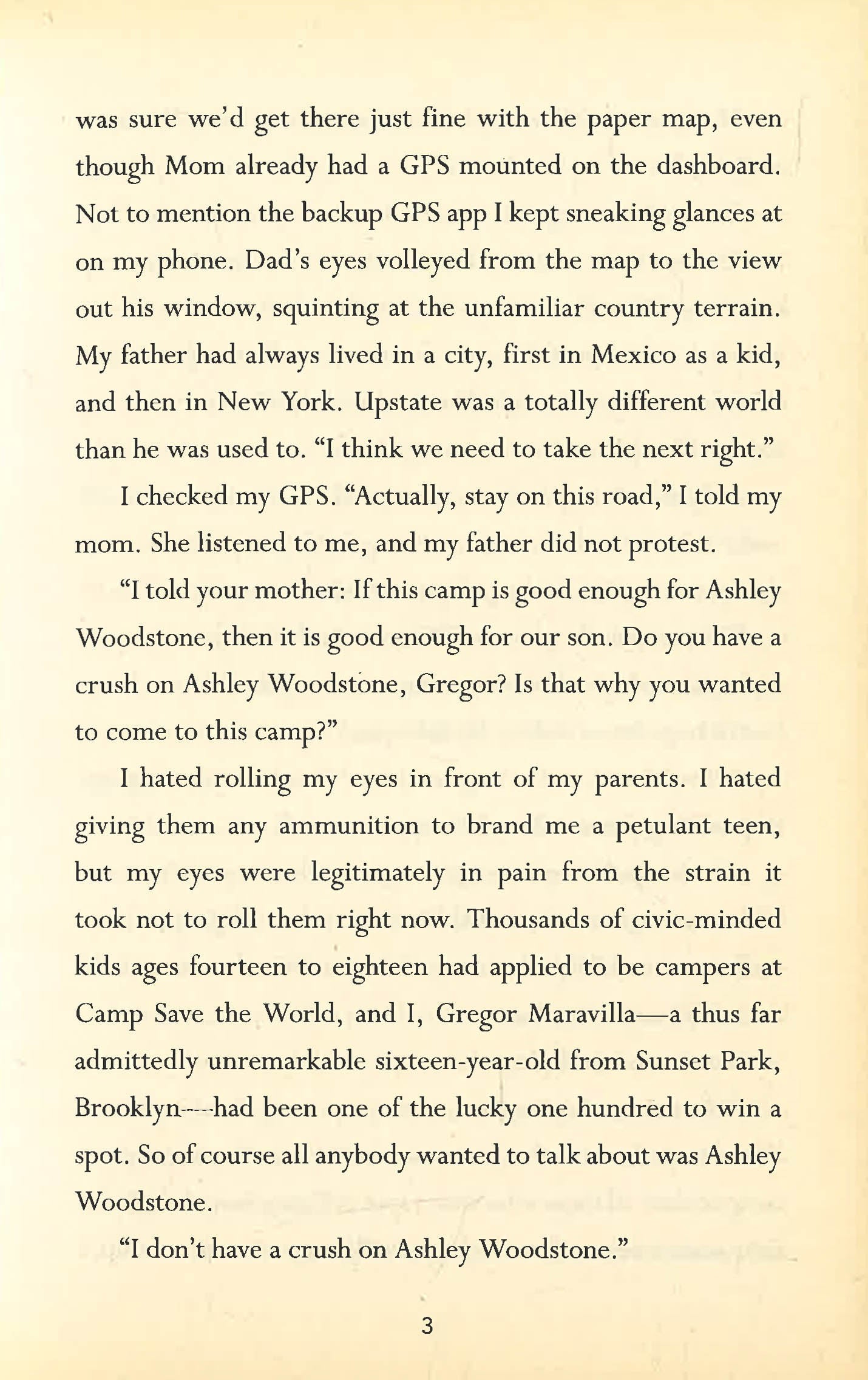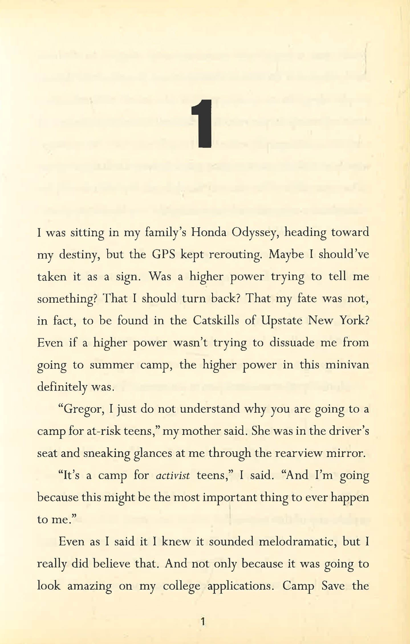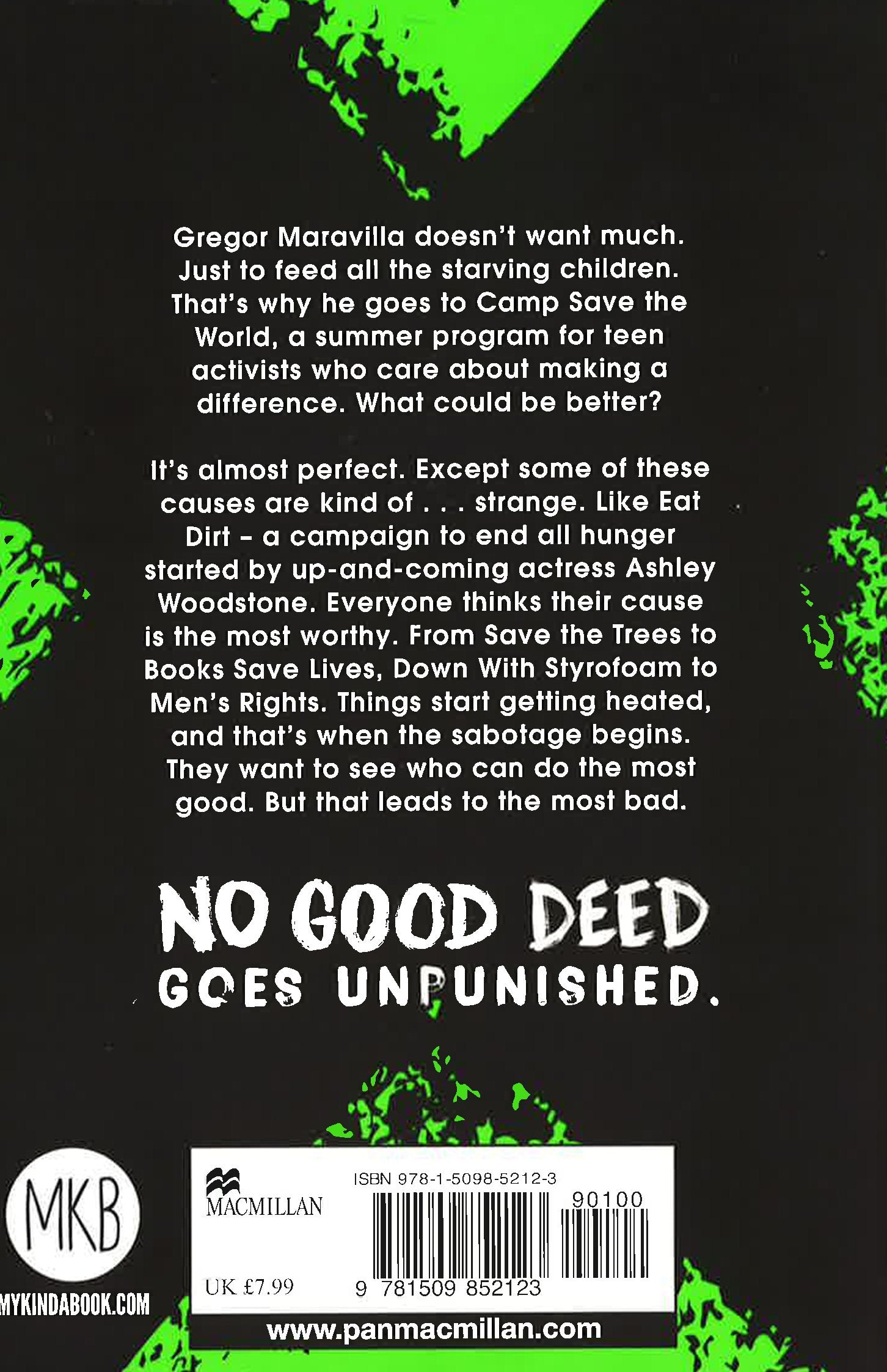 He's not asking for much. All Gregor Maravilla wants to do is feed all the starving children on the planet. So when he's selected to join Camp Save the World - a special summer program for teenage activists from all over the country - to champion their cause, Gregor's sure he's on the path to becoming Someone Great. But then a prize is announced. It will be awarded at the end of summer to the activist who shows the most promise in their campaign. Gregor's sure he has the prize in the bag, especially compared to some of the other campers' campaigns. Like Eat Dirt, a preposterous campaign started by Ashley Woodstone, a famous young actor who most likely doesn't even deserve to be at the camp. Everywhere Gregor goes, Ashley seems to show up ready to ruin things. Plus, the prize has an unforeseen side effect: turning a quiet summer into cut-throat warfare, where campers stop focusing on their own campaigns and start sabotaging everyone else's.