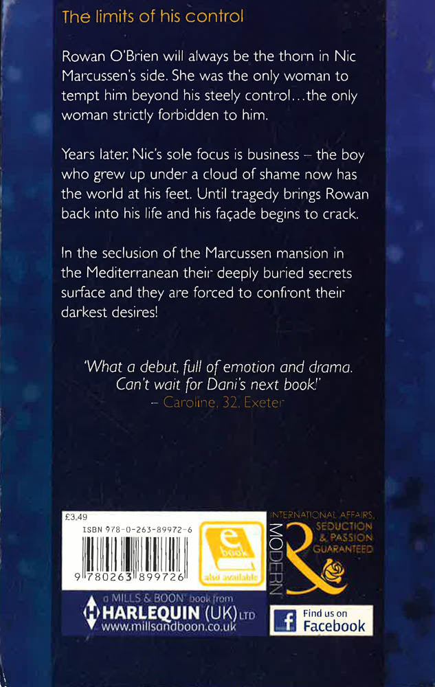 The limits of his control Rowan O'Brien will always be the thorn in Nic Marcussen's side. She was the only woman to tempt him beyond his steely control... the only woman strictly forbidden to him. Years later, Nic's sole focus is business - the boy who grew up under a cloud of shame now has the world at his feet. Until tragedy brings Rowan back into his life and his facade begins to crack. In the seclusion of the Marcussen mansion in the Mediterranean their deeply buried secrets surface and they are forced to confront their darkest desires! `What a debut, full of emotion and drama. Can't wait for Dani's next book!' - Caroline, 32, Exeter