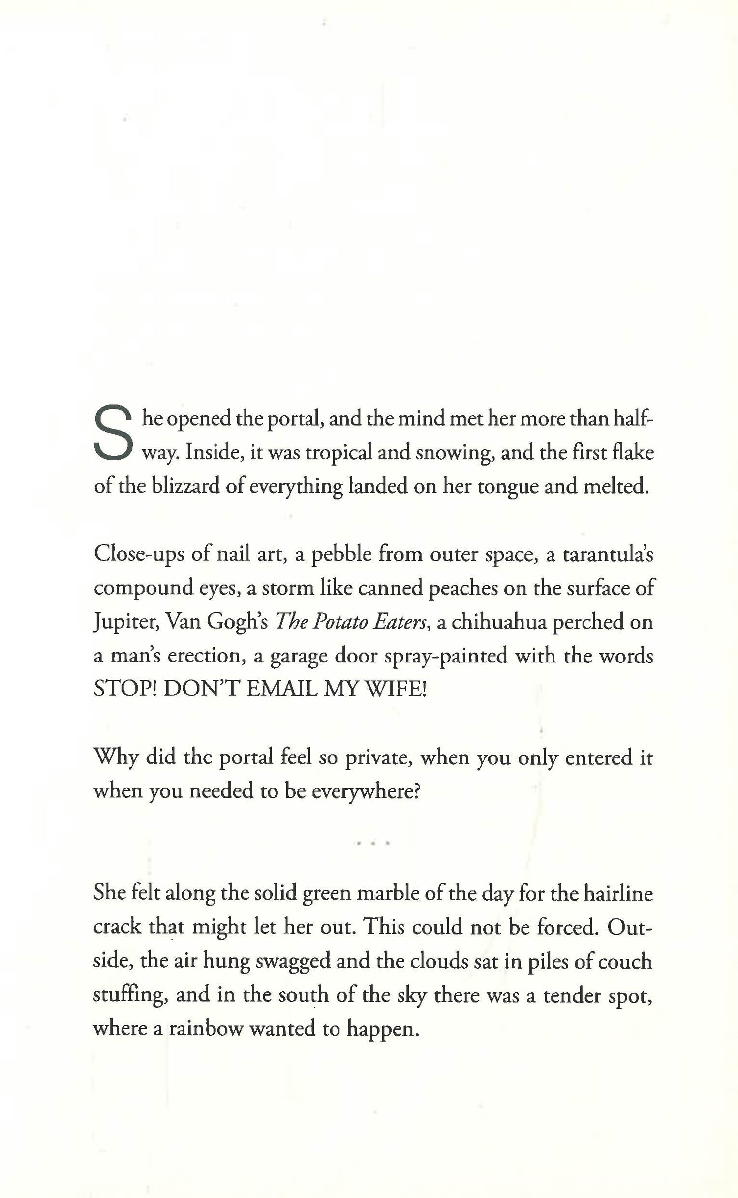 Suddenly, two texts from her mother pierce the fray: "Something has gone wrong," and "How soon can you get here?" As real life and its stakes collide with the increasingly absurd antics of the portal, the woman confronts a world that seems to contain both an abundance of proof that there is goodness, empathy, and justice in the universe, and a deluge of evidence to the contrary.