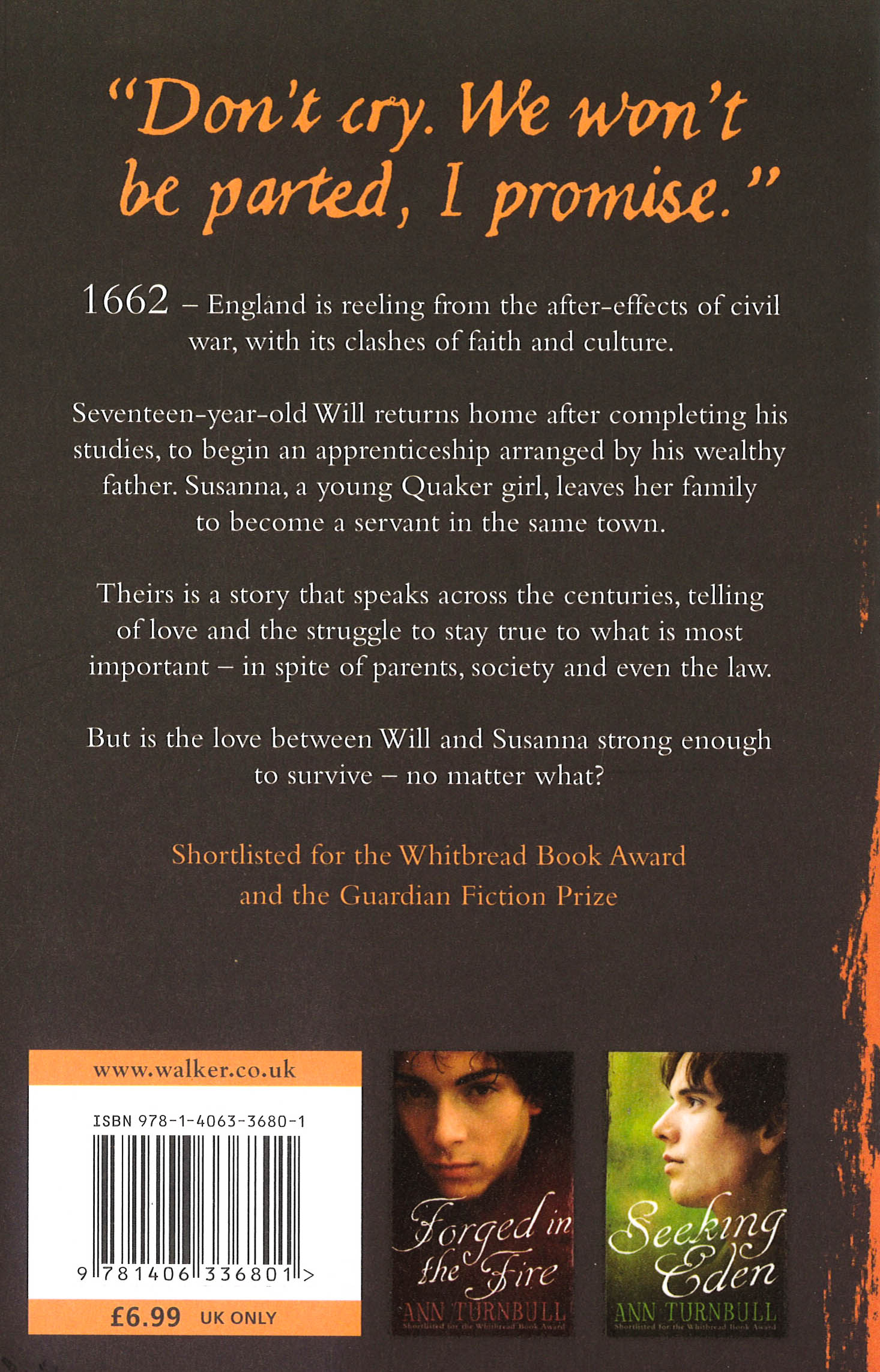 1662 - England is reeling from the after-effects of civil war, with its clashes of faith and culture. Seventeen-year-old Will returns home after completing his studies, to begin an apprenticeship arranged by his wealthy father. Susanna, a young Quaker girl, leaves her family to become a servant in the same town. Theirs is a story that speaks across the centuries, telling of love and the struggle to stay true to what is most important - in spite of parents, society and even the law. But is the love between Will and Susanna strong enough to survive - no matter what?