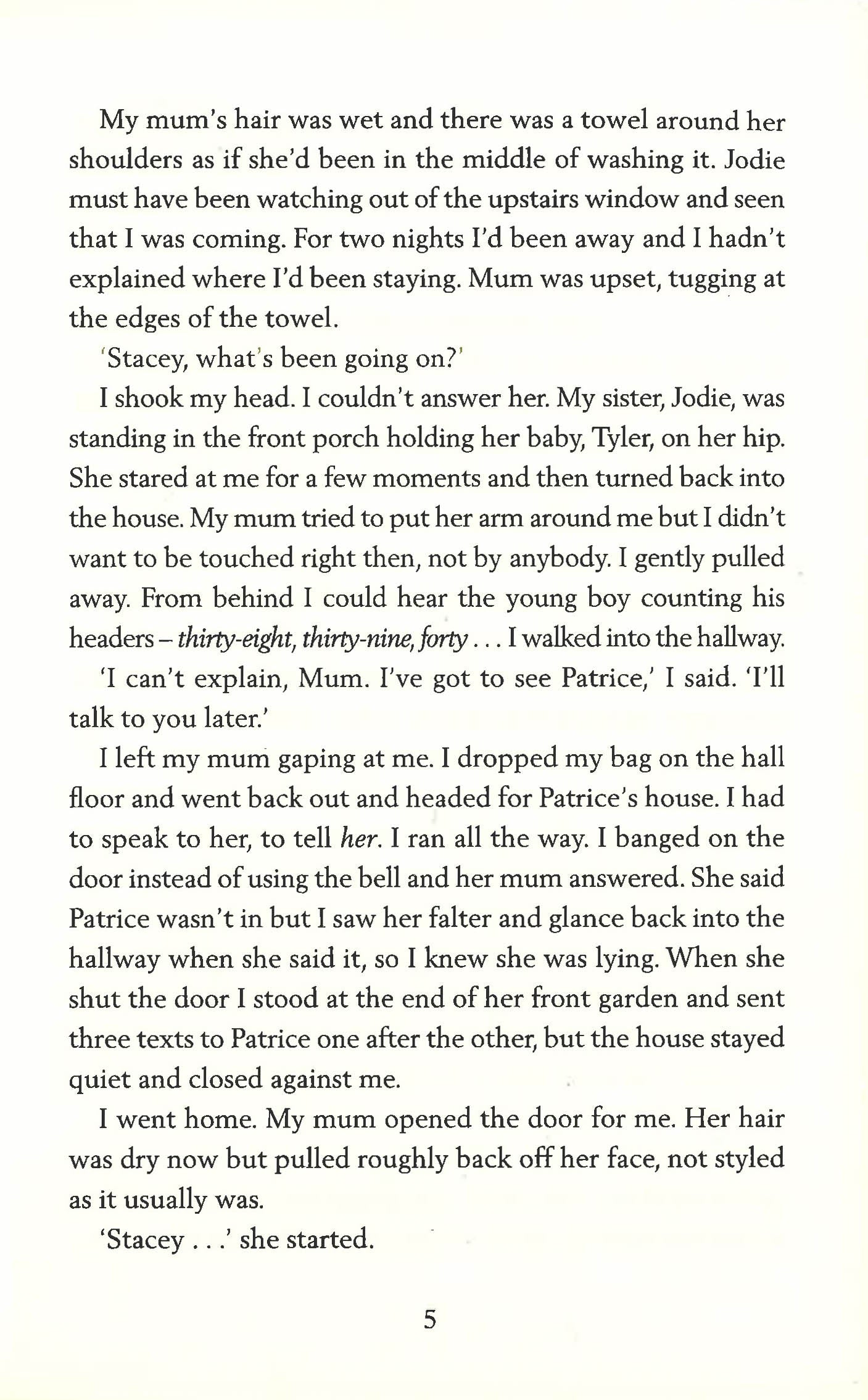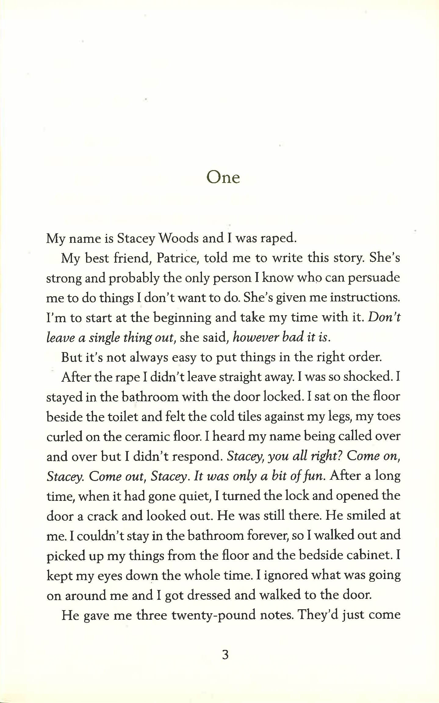Stacey is the victim of a terrible sexual attack. She does not feel able to go to the police, or talk about it to anybody other than her best friend, Patrice. Patrice, outraged, when she cannot persuade her to go to the police, encourages Stacey to write everything down. This is Stacey's story.