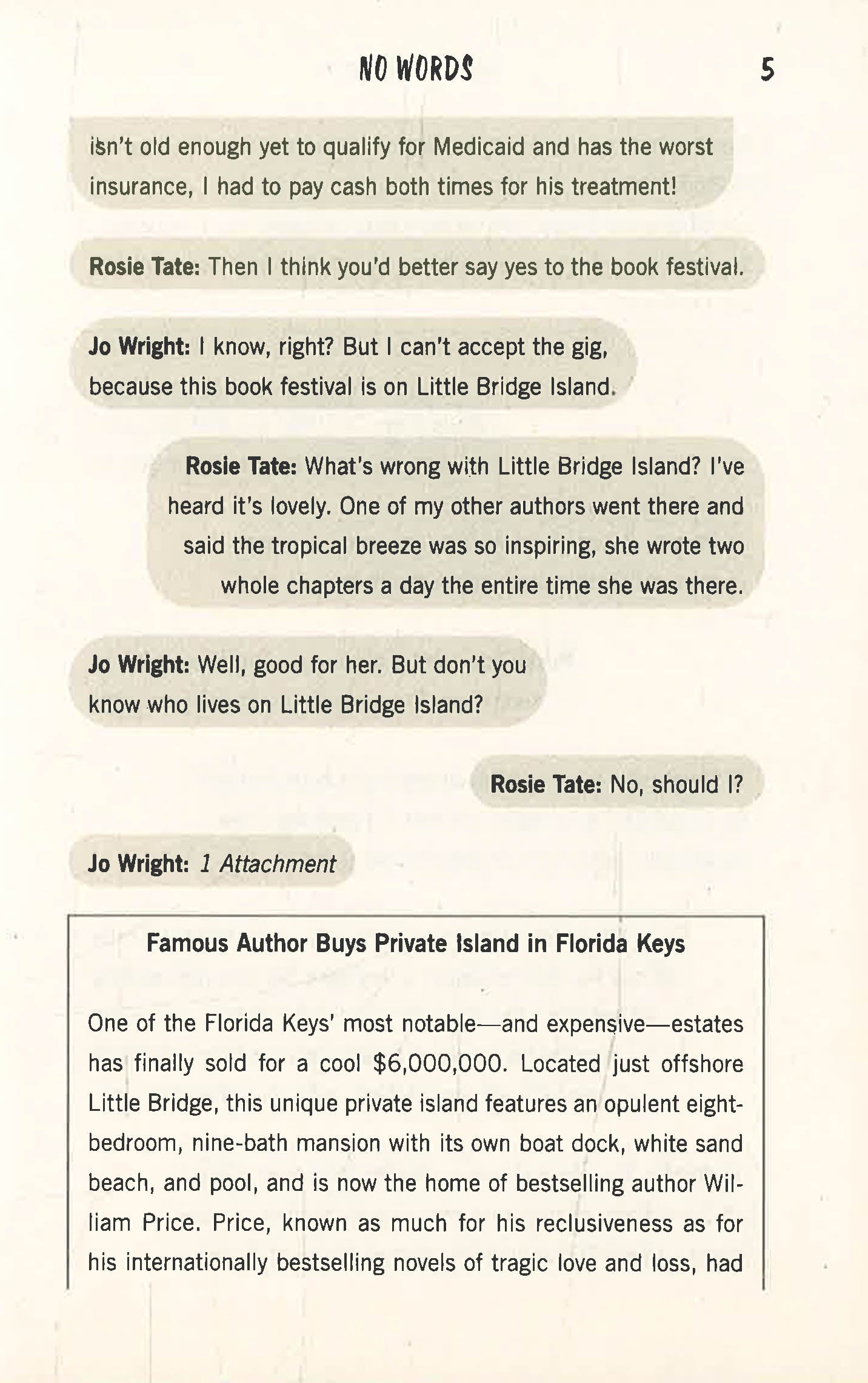 Welcome to Little Bridge, one of the most beautiful islands in the Florida Keys, home to sandy white beaches, salt-rimmed margaritas and sizzling romance . . .Jo Wright always swore she'd never step foot on Little Bridge Island - not as long as her nemesis, bestselling author Will Price, is living there. Then Jo's given an offer she can't refuse: an all-expenses paid trip to speak and sign at the island's first ever book festival. And when she finds out Will won't even be on the island, there's no reason to refuse. But when she arrives on Little Bridge, Jo is in for a shock: Will is not only at the book festival, but seems genuinely sorry for his past actions - and more than willing not only to make amends, but prove to Jo that he's a changed man. Things seem to be looking up - until disaster strikes, causing Jo to wonder: do any of us ever really know anyone?