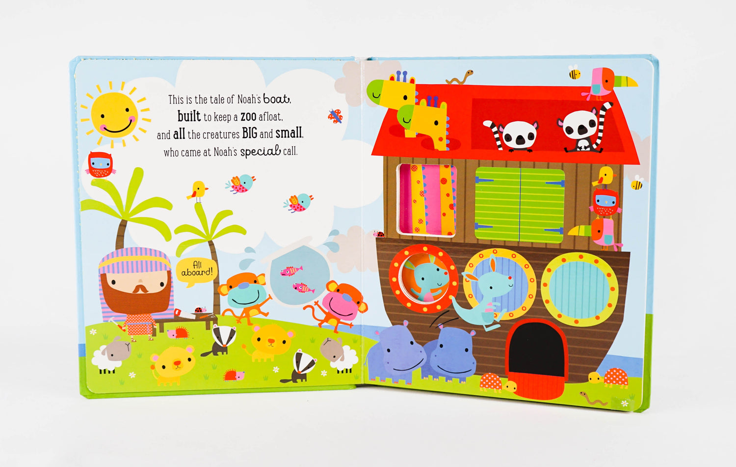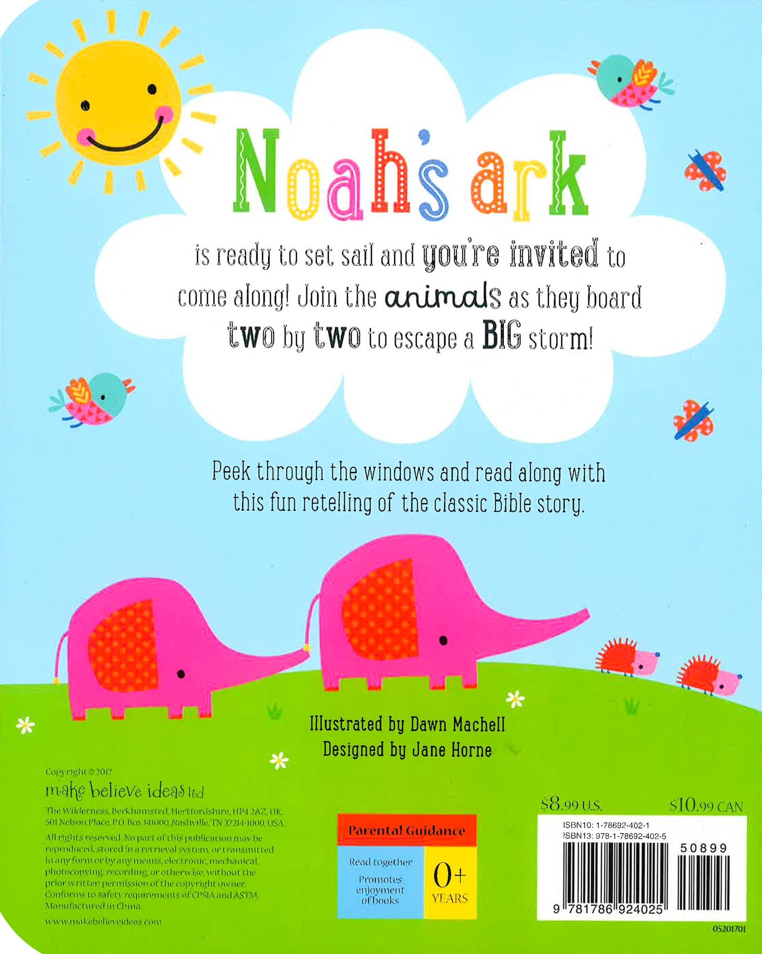 Noah's ark is ready to set sail and you're invited to come along! Join the animals as they board two by two to escape a big storm! Peek through the windows and read along with this fun retelling of the classic Bible story.