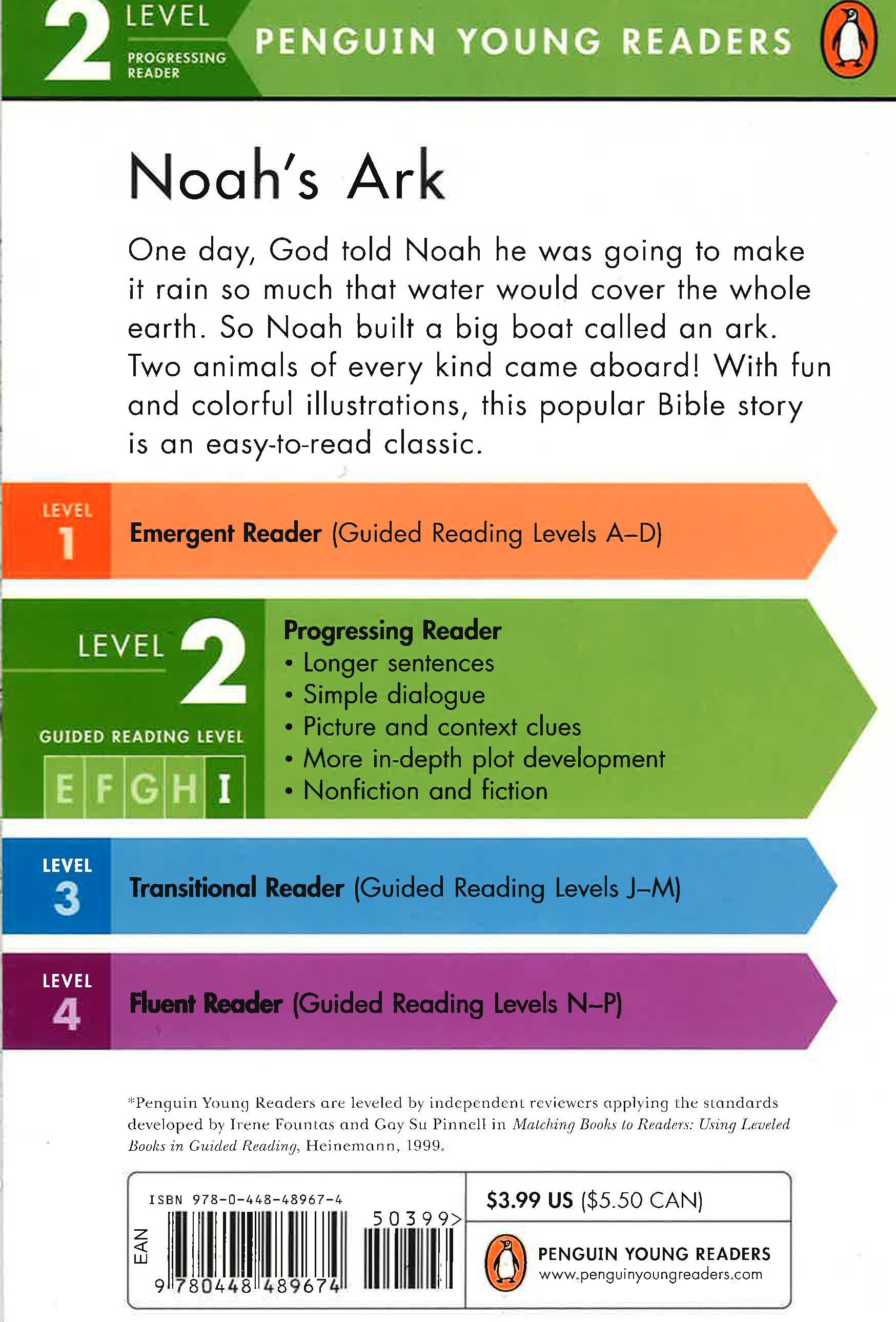 One of the most well-known biblical stories joins the Penguin Young Readers program! This simple, easy-to-read story tells the centuries-old biblical tale of Noah and his ark. When God warns Noah that he will unleash a powerful rainstorm from the heavens, Noah builds the boat that will keep him, his family, and two of every animal in the world safe during the great storm that lasts for forty days and forty nights.