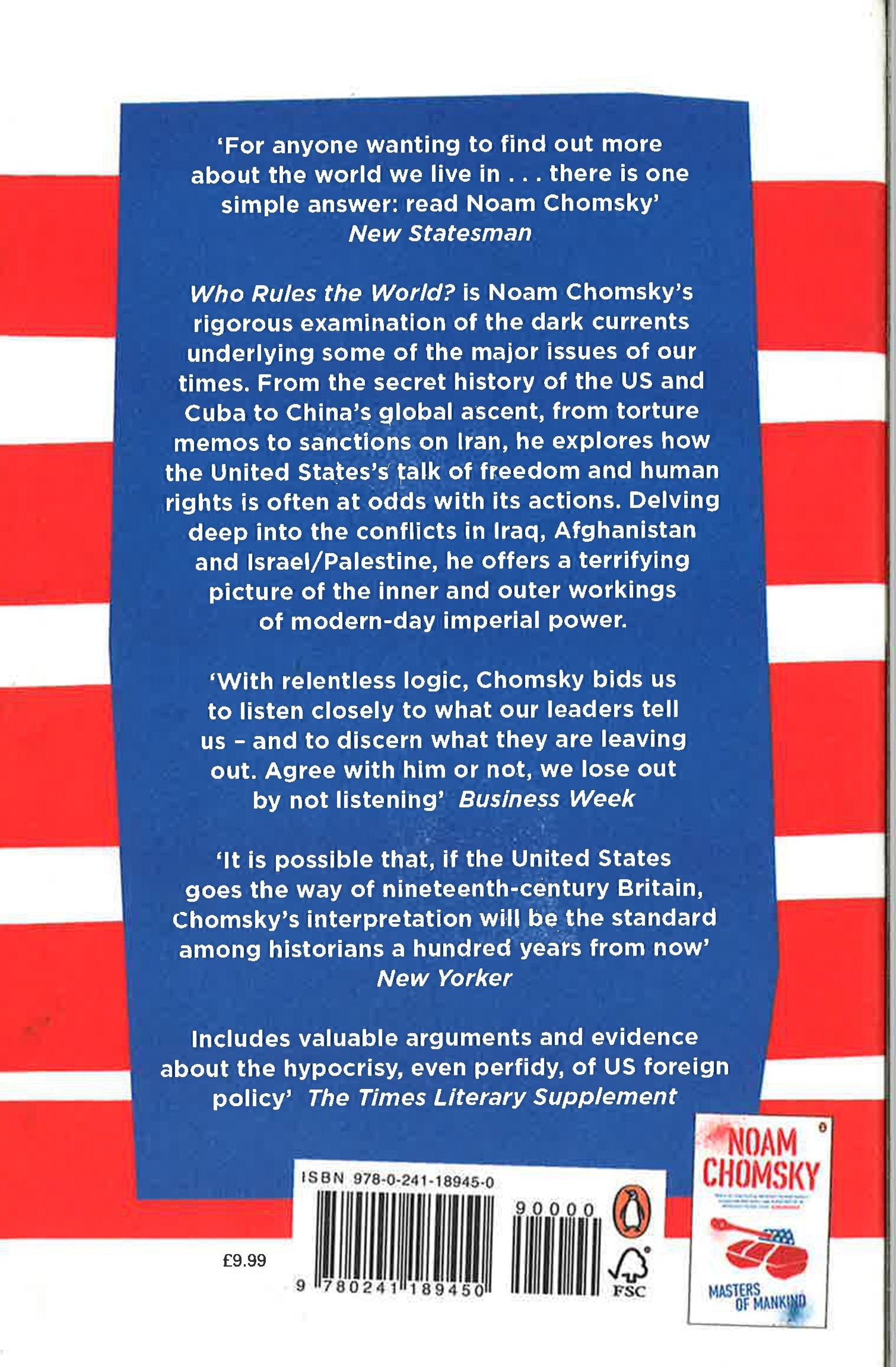 Who Rules the World is the essential account of geopolitics right now - including an afterword on President Donald Trump Noam Chomsky: philosopher, political writer, fearless activist. No one has done more to question the hidden actors who govern our lives, calling the powers that be to account. Here he presents Who Rules the World?, his definitive account of those powers, how they work, and why we should be questioning them.From the dark history of the US and Cuba to China's global rise, from torture memos to sanctions on Iran, this book investigates the defining issues of our times and exposes the hypocrisy at the heart of America's policies and actions. The world's political and financial elite are now operating almost totally unconstrained by the so-called democratic structure. With climate change and nuclear proliferation threatening our very survival, dissenting voices have never been more necessary.Fiercely outspoken and rigorously argued, Who Rules the World? is an indispensable guide to how things really are.