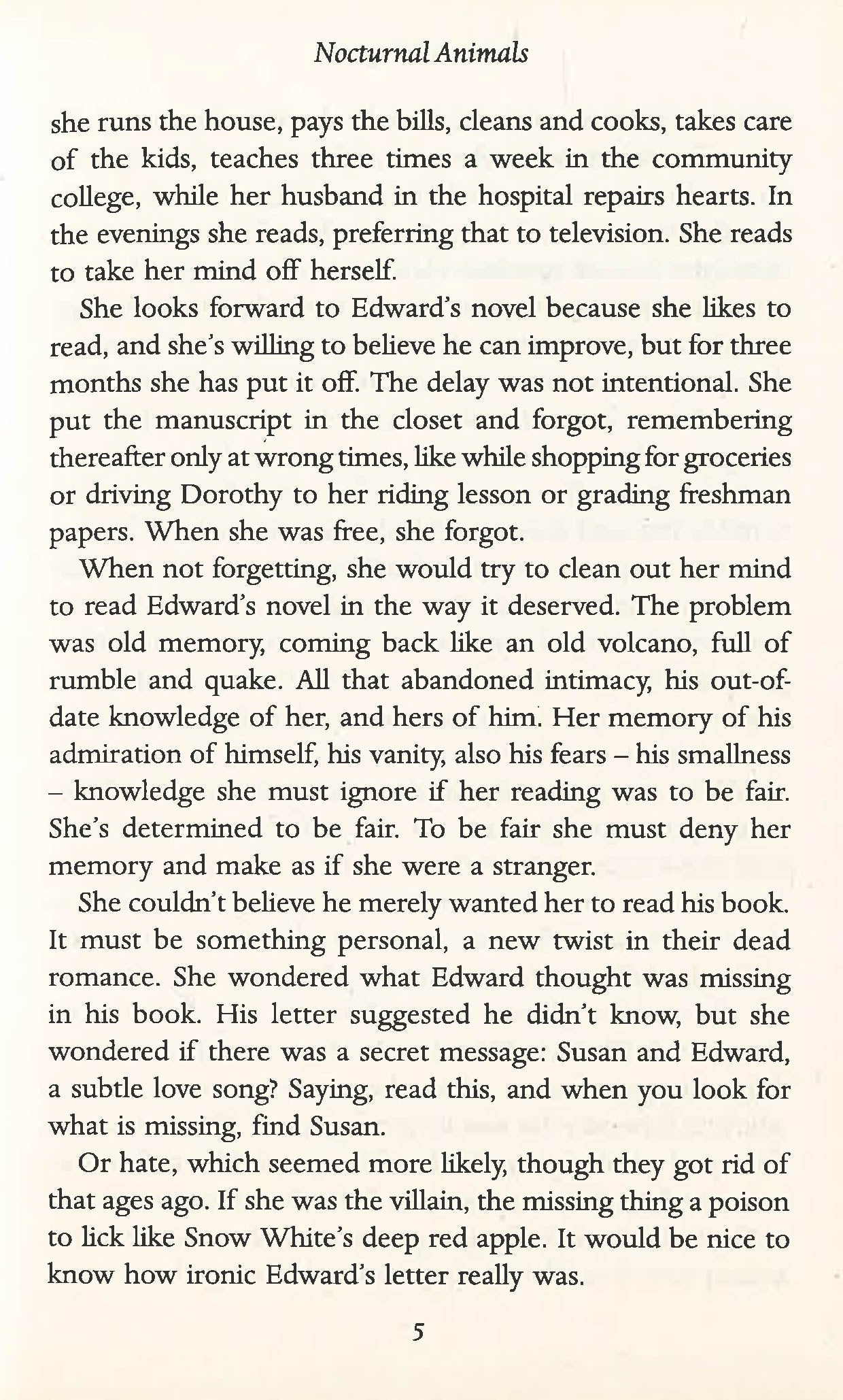 The novel that inspired the 2016 major motion picture Nocturnal Animals, starring Jake Gyllenhaal and Amy Adams, is a dazzling, eerie, riveting thriller of fear and regret, blood and revenge. Many years after their divorce, Susan Morrow receives a strange gift from her ex-husband. A manuscript that tells the story of a terrible crime: an ambush on the highway, a secluded cabin in the woods; a thrilling chiller of death and corruption. How could such a harrowing story be told by the man she once loved? And why, after so long, has he sent her such a disturbing and personal message...? Originally published as Tony and Susan.