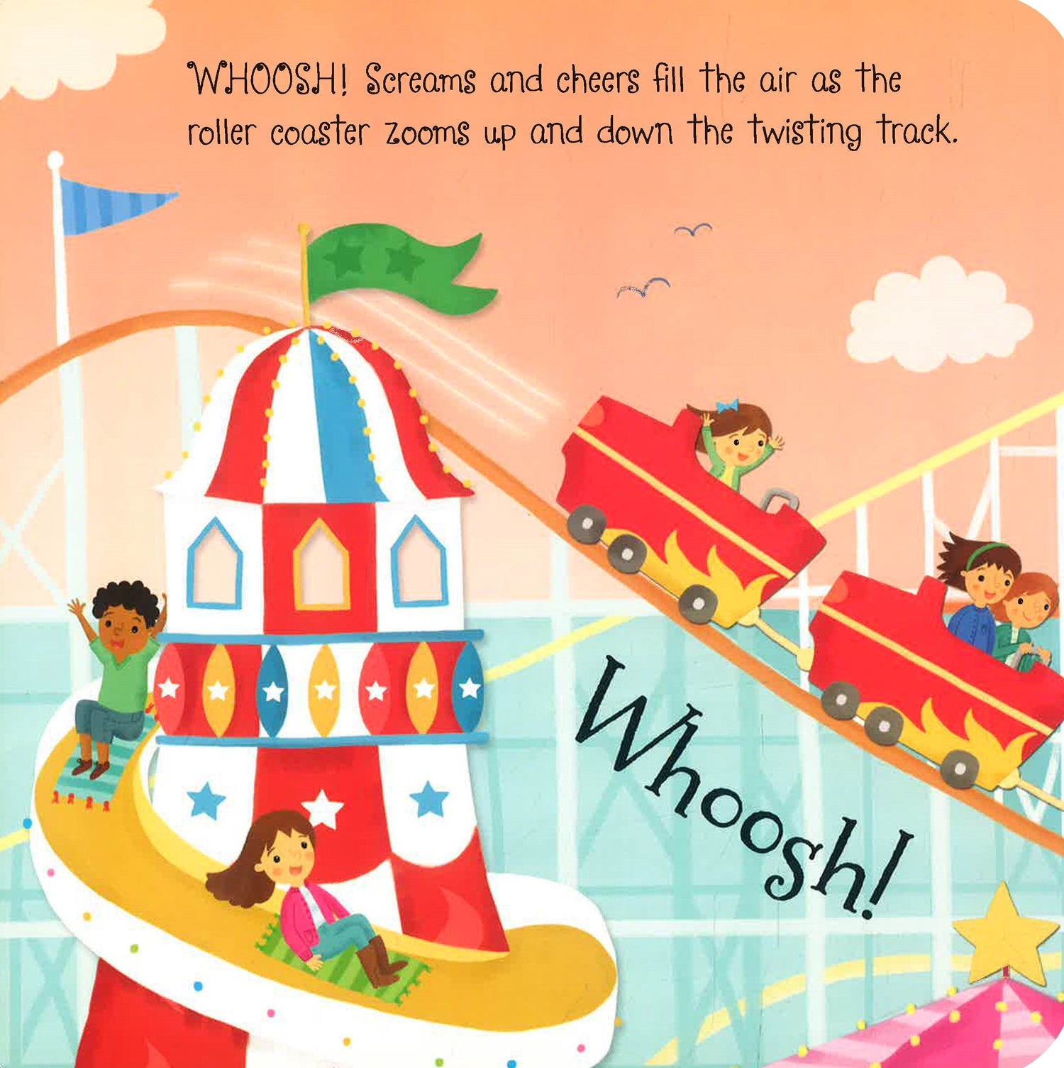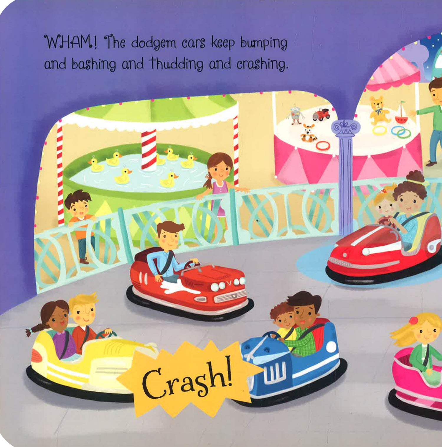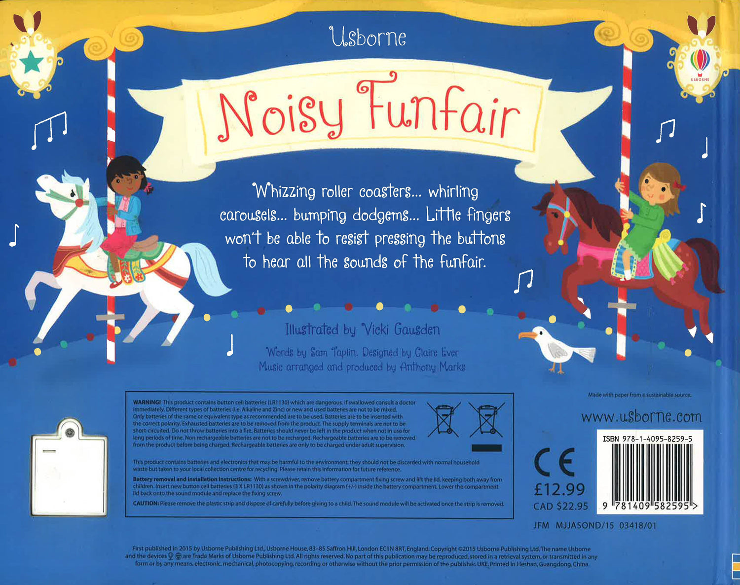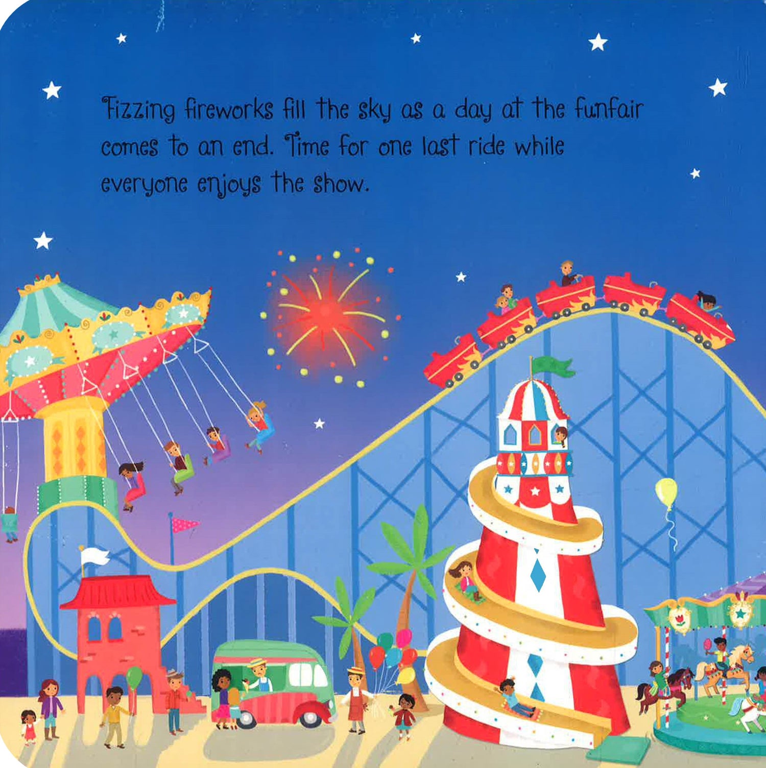 All of the fun of the fair can be found within the pages of this lively noisy book. Colourful illustrations are accompanied by buttons which children can press to hear the joyful music of the carousel, the screams of those riding the Ghost Train, and the bangs of the fireworks at the end of the night, accompanied by ooohs and ahhhs from the crowd.