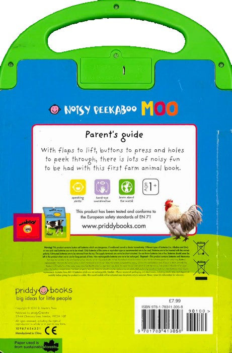 An animal-themed board book with multiple novelties: a four-button sound bar, integrated lift-the-flaps and a carry handle. Each page has a big flap to lift with a peekaboo hole showing part of an animal underneath - children will have fun guessing what the animal is, then lifting the flap to see if they are right. Sound bar has four buttons to press so that children can listen to and learn the noise made by four of the animals featured in the book. Handle allows lift-the-flap, carry-along noisy animal fun. As well as helping babies and toddlers learn about animals, promote multiple early skills including speech development and hand-eye coordination.