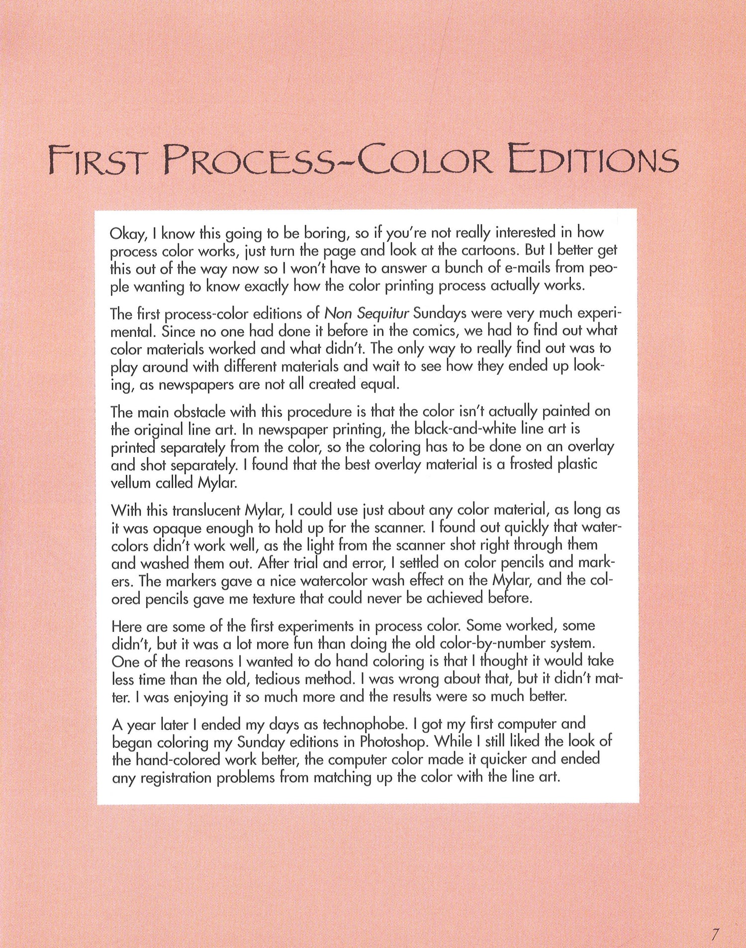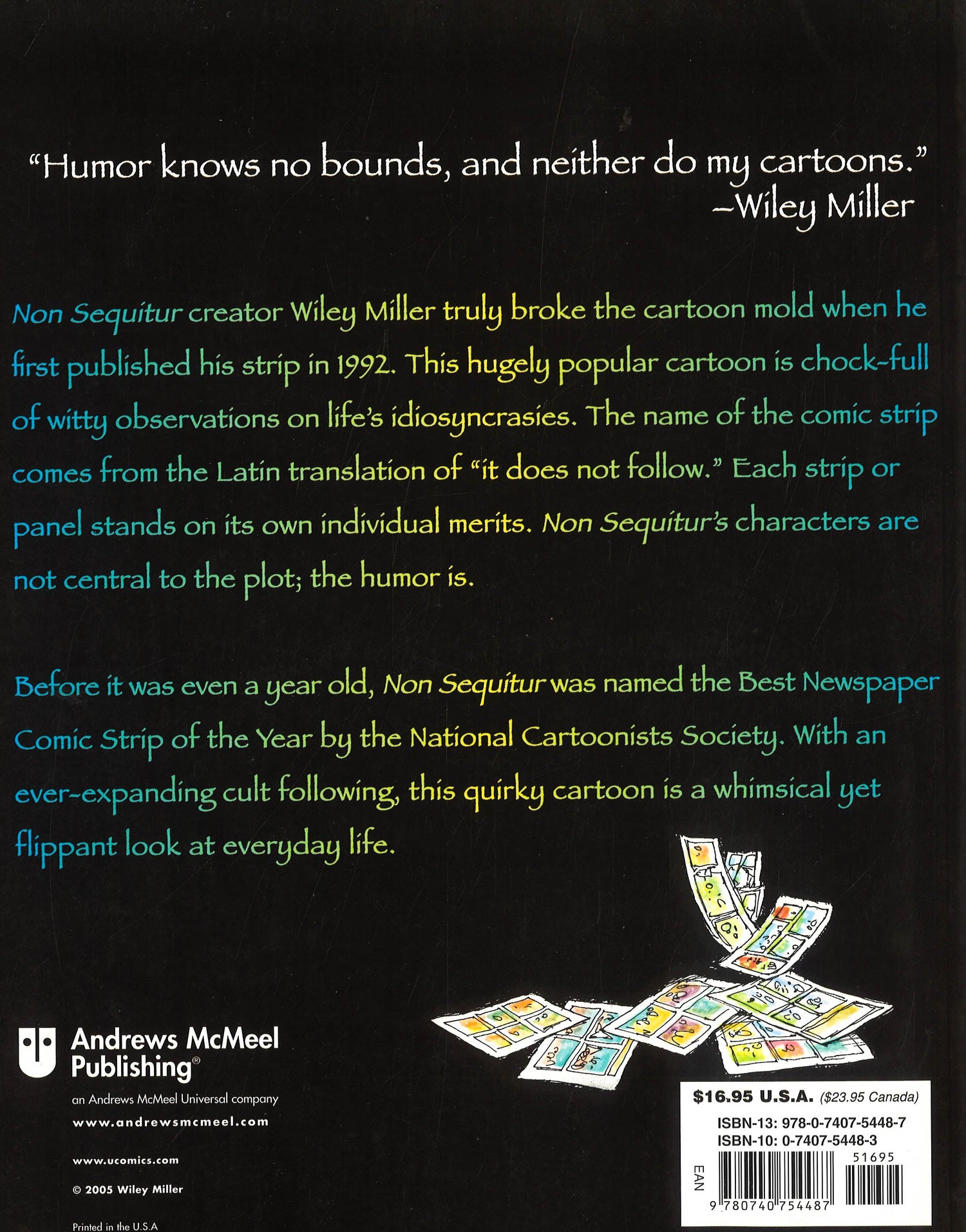 Non Sequitur creator Wiley Miller truly broke the cartoon mold when he first published his strip in 1992. This hugely popular cartoon is chock-full of witty observations on life's idiosyncrasies. The name of the comic strip comes from the Latin translation of "it does not follow." Each strip or panel stands on its own individual merits. Strips do not follow in a sequence and are not related. Non Sequitur's characters are not central to the plot; the humor is.