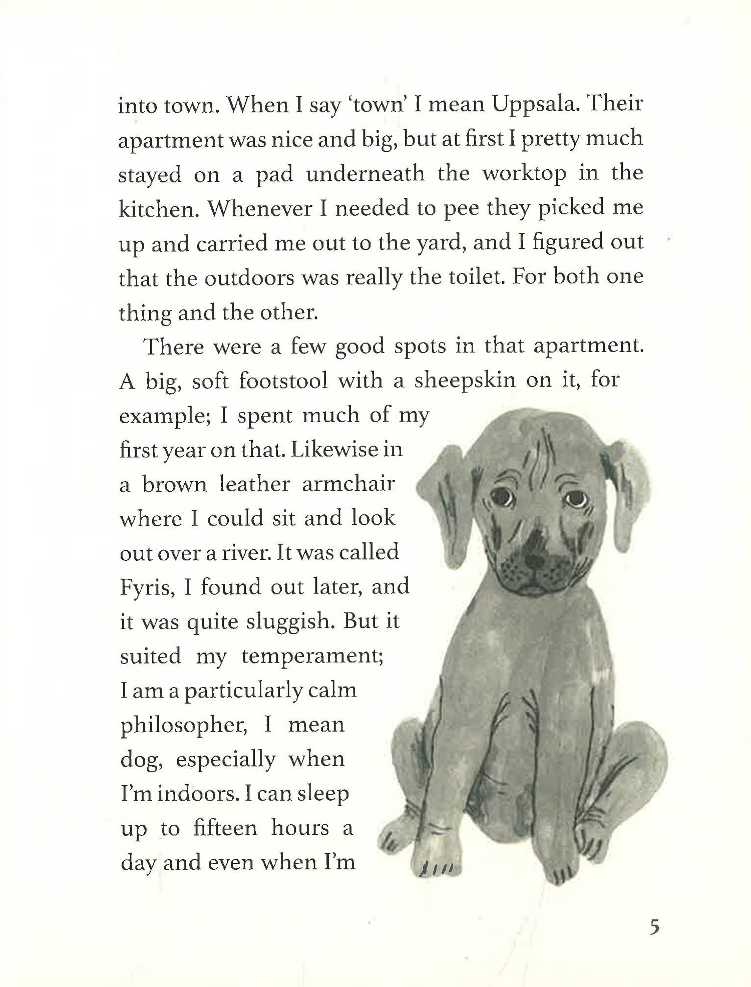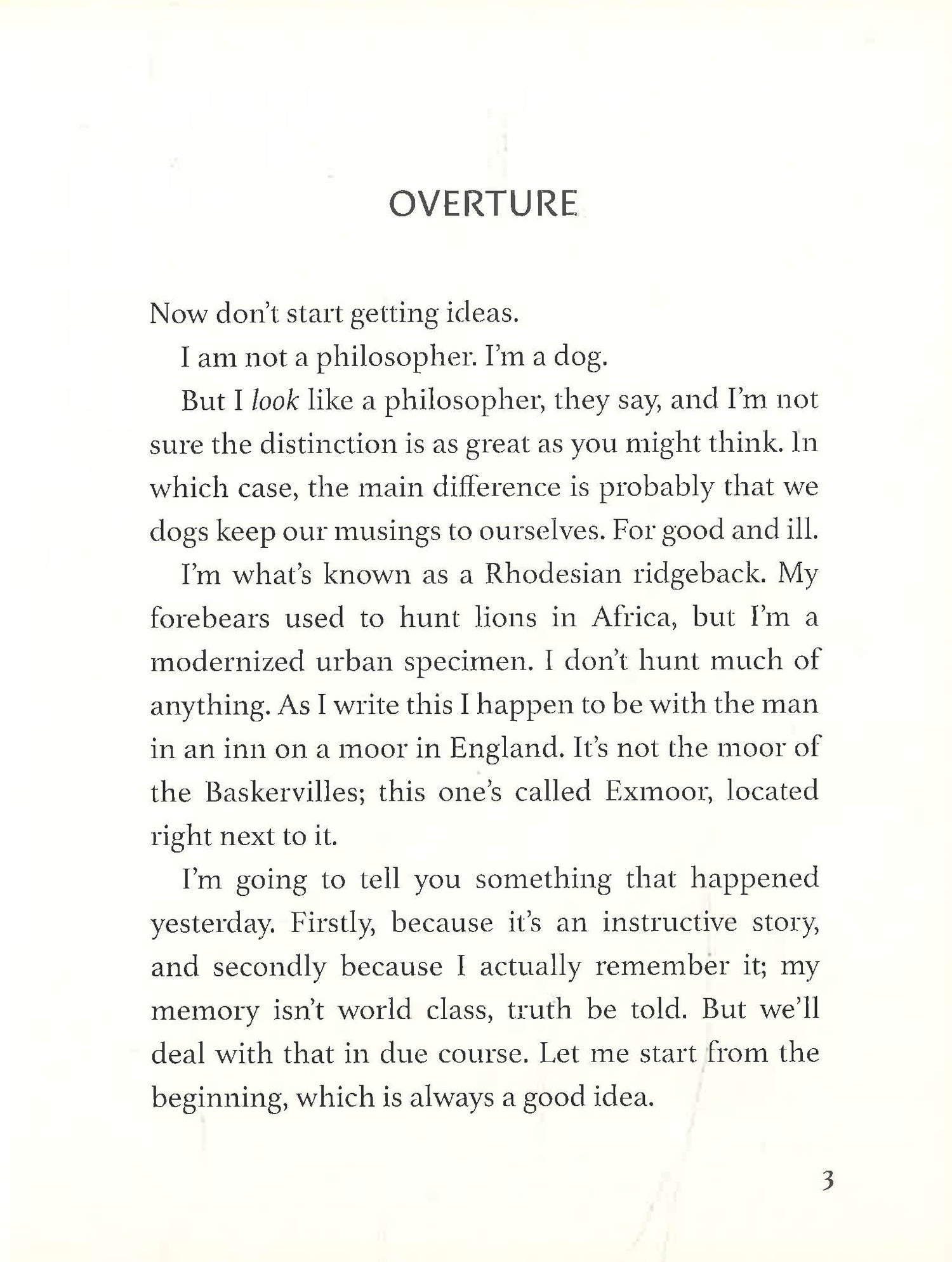 Now don't start getting ideas. I am not a philosopher. I'm a dog. But I look like a philosopher, they say, and I'm not sure the distinction is as great as you might think. I'm what's known as a Rhodesian Ridgeback. My forebears used to hunt lions in Africa, but I'm a modernized urban specimen. I don't hunt much of anything. I was born somewhere on the plains west of Uppsala, Sweden. In the beginning I was blind and tumbled around with my siblings. We pooped and bit each other and nursed, and our mother — who I must admit was kind of a bitch — tried to raise us to the best of her ability. Without all that much success, I must say too. When I was about two months old I was adopted. Two long-legged humans, a man and a woman, came and picked me up, loaded me in a car and drove into town. This is the story of the eleven years we spent together.