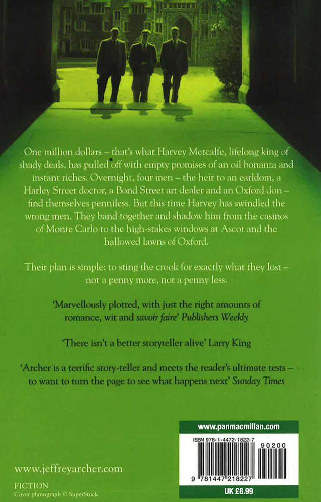 Jeffrey Archer's first novel, Not a Penny More, Not a Penny Less, is page-turning tale of fraud, revenge and determination as four men stop at nothing to get back what was stolen from them.One million dollars - that's what Harvey Metcalfe, lifelong king of shady deals, has pulled off with empty promises of an oil bonanza and instant riches. Overnight, four men - the heir to an earldom, a Harley Street doctor, a Bond Street art dealer and an Oxford don - find themselves penniless. But this time Harvey has swindled the wrong men. They band together and shadow him from the casinos of Monte Carlo to the high-stakes windows at Ascot and the hallowed lawns of Oxford. Their plan is simple: to sting the crook for exactly what they lost - not a penny more, not a penny less.