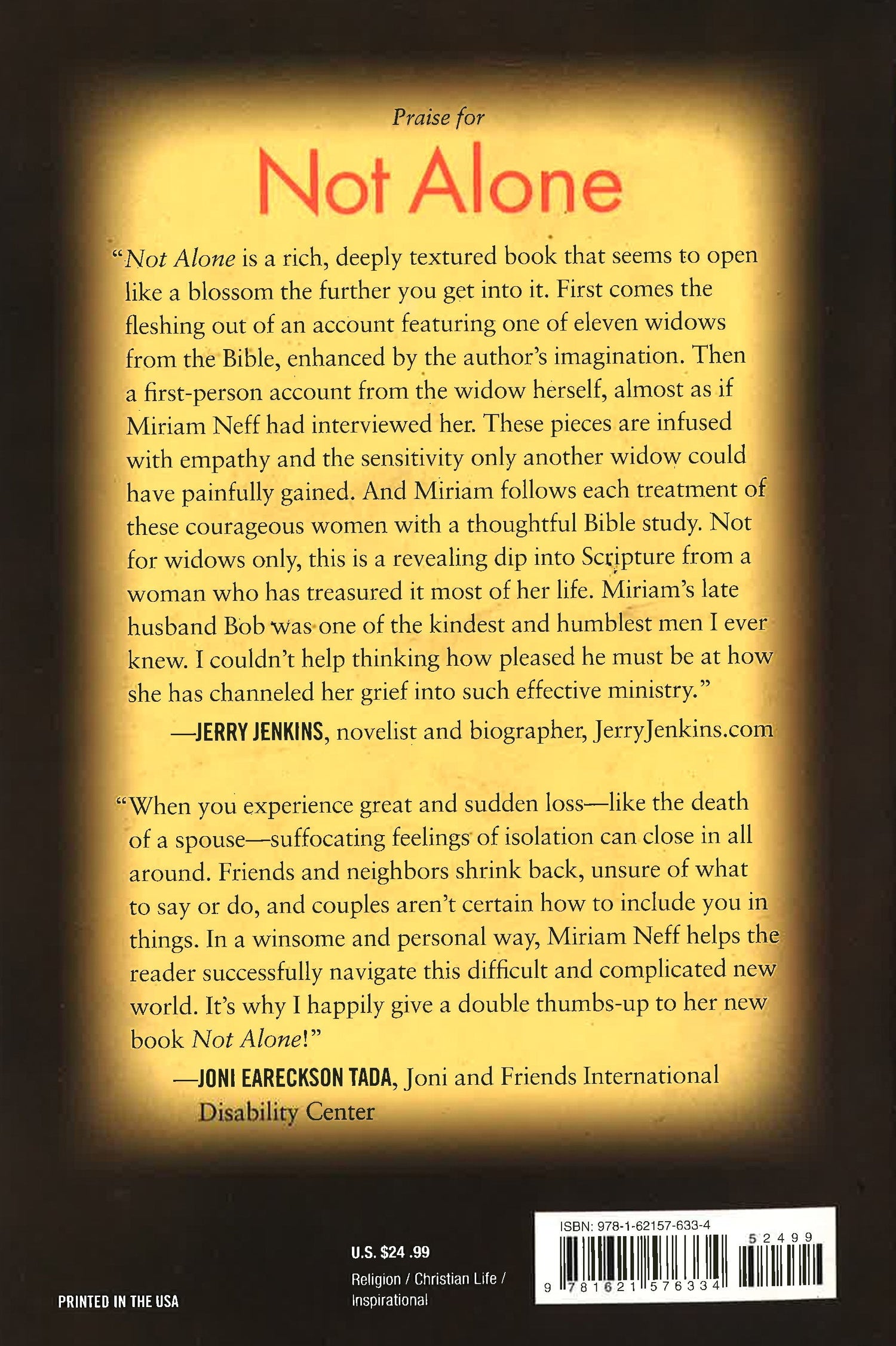 Miriam Neff shares this essential message through the powerful testimony of eleven widows in the Bible. Their stories are brought to narrative life in lyrical, first person prose that takes readers deep inside these women's grief, strength, and faith. Both haunting and hopeful, the moving stories in Not Alone remind us what it means to love—and what it means to live with God.