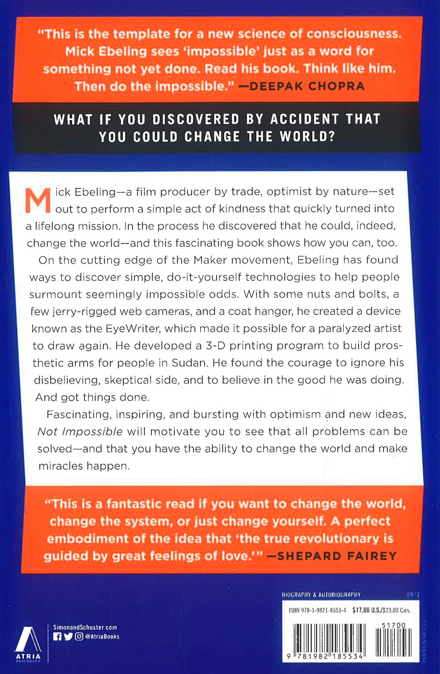 A true testament to the power of determination, Not Impossible is the launching pad for you to uncover your abilities to change the world, too. Bursting with optimism and new ideas, “this is the template for a new science of consciousness. Mick Ebeling sees impossible just as a word for something not yet done. Read his book. Think like him. Then do the impossible” (Deepak Chopra).